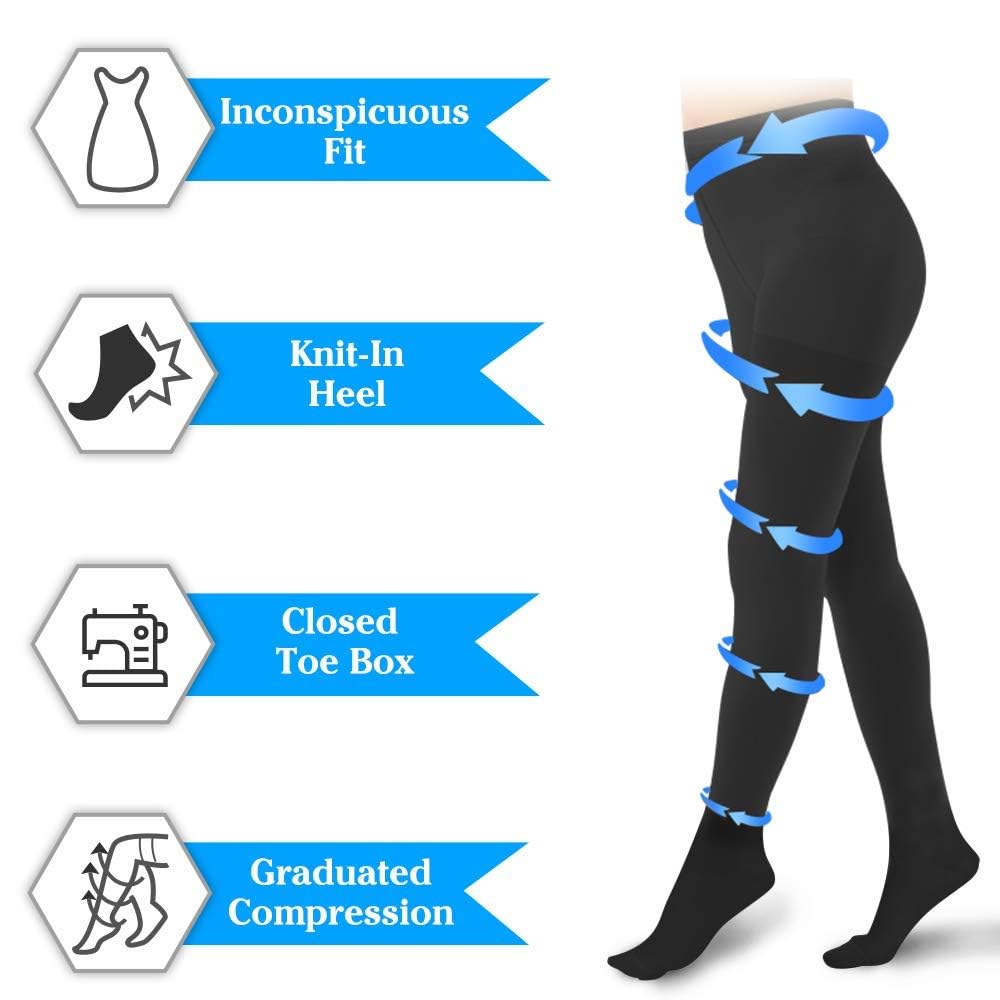 20-30 mmHg Compression Pantyhose Stockings: They help prevent and relieve mild varicose veins, leg swelling and edema, leg fatigue, and soreness, and create a body-sculpting effect through compression of the legs and thighs.