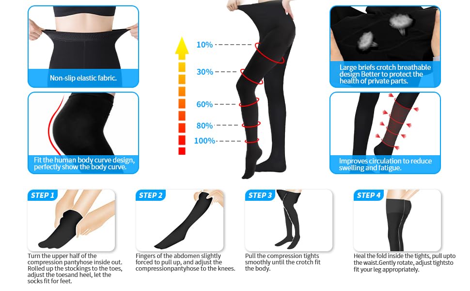 Buyers Please Note: To ensure the compression effect, XUANSHOW's closed toe compression panty hose provide strong compression and tight material, please follow this method to wear: 1. Turn the socks inside and out, 2. Pull the socks up from the toes, 3. Slowly flip the socks, 4. Pull the socks to the waist with both hands, 5. Lift it to the waist.