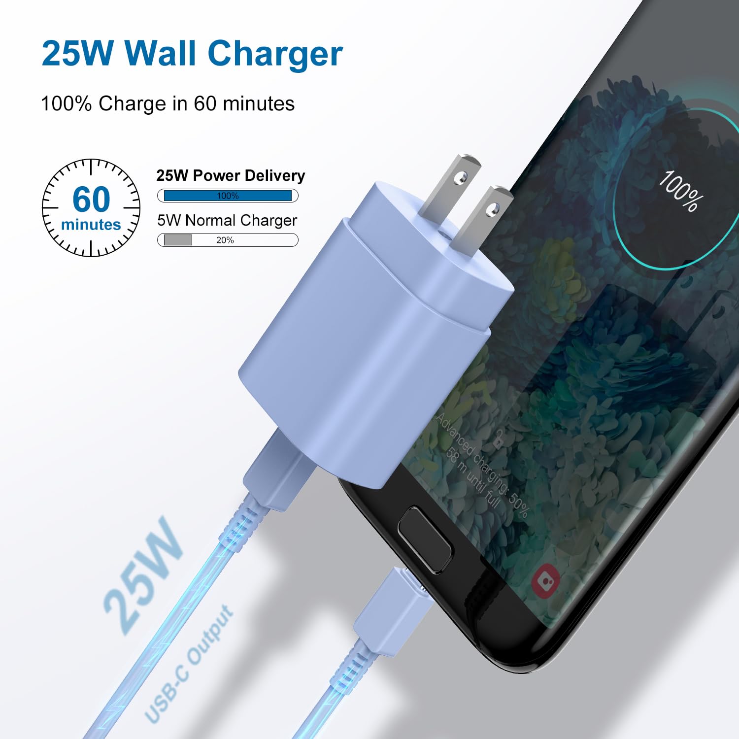 【Compatibility List】 for Samsung Galaxy Galaxy S23 5G/ S23+ 5G/ S23 Ultra 5G Galaxy S22 5G/ S22+ 5G/ S22 Ultra 5G Galaxy S21 5G/ S21+ 5G/ S21 Ultra 5G/ S21 FE Galaxy S20 5G/ S20+ 5G/ S20 Ultra 5G/ S20 FE/ S10/ S10+/ S10e Galaxy Note 20/ Note 20 Ultra/ Note 10/ Note 10+ / Galaxy Z Fold 2/ Z Fold 3/ Z Fold 4/ Z Flip/ Z Flip 3/ Z Flip 4/ F52 Galaxy Note 9/ Note 8/ S9/ S9 Plus/ S9 Active/ S8/ S8+/ S8 Active Galaxy A90/ A80/ A72/ A72s/ A71/ A70/ A70s/ A53(5G)/ A52(5G)/ A52s(5G)/ A13 Galaxy A60/ A51(5G)/ A50/ A42/ A41/ A40/ A33/ A32(5G)/ A31/ A23/ A22(5g)/ A21s/ A21/ A20/ A12/ A11/ A10/ A10E/ A9/ A8/ A7/ A6/ A5/ A3/ A03/ A03s/ A02s Samsung Galaxy Tab A7, A8, S5e, S6, S7, S8 for Google Devices Pixel 7, Pixel 7 Pro, Pixel 7a, Pixel 6, Pixel 6 Pro, Pixel 6a, Pixel 5, Pixel 5a, Pixel 4, Pixel 4 XL, Pixel 3, Pixel 3A, Pixel 3 XL, Pixel 2, Pixel 2XL for Apple Devices iPad (10th) (2022) iPad Pro 12.9 in (3/ 4/ 5/ 6th) (2018/ 2020/ 2021/ 2022) iPad Pro 11 in (1/ 2/ 3/ 4th) (2018/ 2020/ 2021/ 2022) iPad Air (4/ 5th) (2020/ 2022) iPad mini (6th) (2021) INPUT: 100 - 240 VAC ; 50-60HZ 0.70A OUTPUT: 9V/2.75A ; 5V/3.00A 【Features】 Safe Super Fast Charger & Sync Super fast charger delivers up to output current of 25W, 75% faster than standard chargers, it also has the sync feature, most importantly, it is made for safe charging, it can intelligently recognize the battery type and status, will automatically stop charging when fully charged to prevent from short circuit, over-current, over-voltage, over-heating and over-charging. Fully Charged in 60min Super Fast charger delivers up to 3 Amp to give your phone power at a much faster rate, enables your battery from zero to 50% in just 30 minute (If your phone does not have fast charger feature, it will take longer)