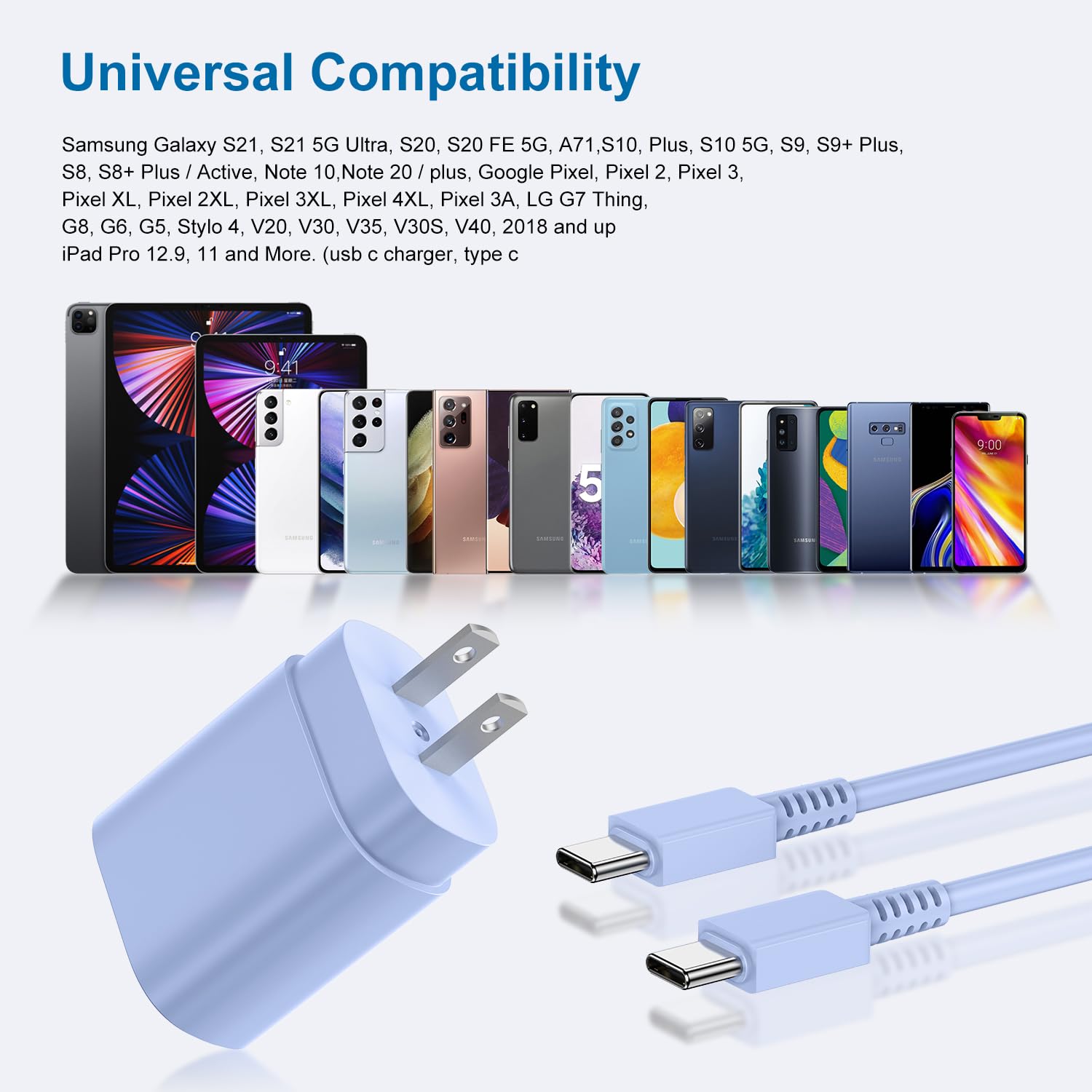 【Wide Compatibility】 USB c fast charger is compatible with: Galaxy S23/ S23 Plus/ S23 Ultra 5G, S22/ S22+/ S22 Ultra 5G, S21/ S21+/ S21 Ultra 5G/ S21 FE, S20/ S20+/ S20 Ultra 5G/ S20 FE 5G, S10/ S10+/ S10e, Note 20/ Note 20 Ultra 5G, Note 10/ Note 10+, Note 9, Note 8, S9/ S9 Plus/ S9 Active, S8/ S8+/ S8 Active, Z Fold 2/ 3/ 4, Z Flip 1/ 3/ 4, iPad (10th), iPad Pro 12.9 (3/ 4/ 5/ 6th), iPad Pro 11 (1/ 2/ 3/ 4th), iPad Air (4/ 5th), iPad mini (6th), GOOGLE Pixel 3, XL, 2XL, 3XL, 4XL, 3A/ LG G5, G6