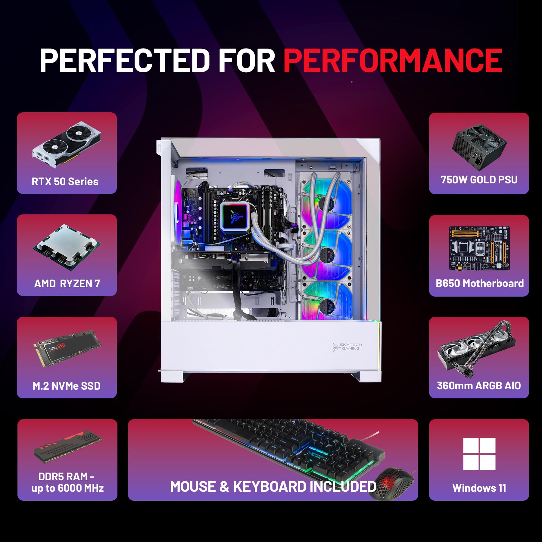 Why accept mediocrity when you can soar ahead with the cutting-edge Skytech Archangel 5 series? Embrace the latest architectures, showcasing top-tier NVIDIA RTX series graphics cards and fueled by an AMD Ryzen 7 Processor. The Skytech Archangel 5 stands out as the ultimate gaming rig offering unparalleled price-to-performance value in the current market BRAND Story: Skytech Gaming is a premier manufacturer of custom and pre-built gaming PCs. With our team of seasoned experts boasting years of collective experience in the industry, we are committed to delivering unparalleled gaming experiences to our esteemed clientele. Our extensive range of gaming PCs ensures that you can select the ideal one tailored to meet your requirements and budget. Every PC we offer is meticulously crafted with top-tier components and is supported by a comprehensive warranty, assuring you of a premium product. The Skytech Archangel 5 is a top-tier gaming computer of the latest generation, designed to effortlessly handle popular games such as Call of Duty, Fortnite, Escape from Tarkov, Grand Theft Auto V, Valorant, World of Warcraft, League of Legends, Apex Legends, PLAYERUNKNOWN’s Battlegrounds, Overwatch 2, Counter-Strike 2, Battlefield V, Minecraft, ELDEN RING Shadow of the Erdtree, Rocket League, Baldur’s Gate 3, Dota 2, HELLDIVERS 2, Monster Hunter, Terraria, Rainbow Six Siege, Dragon’s Dogma 2, Black Myth Wukong, Dragon Age and more at Ultra settings. It delivers stunning Call of Duty, Fortnite, Escape from Tarkov, Grand Theft Auto V, Valorant, World of Warcraft, League of Legends, Apex Legends, PLAYERUNKNOWN’s Battlegrounds, Overwatch 2, Counter-Strike 2, Battlefield V, Minecraft, ELDEN RING Shadow of the Erdtree, Rocket League, Baldur’s Gate 3, Dota 2, HELLDIVERS 2, Monster Hunter, Terraria, Rainbow Six Siege, Black Myth Wukong, Marvel Rivals, Stellar Blade and more at Ultra settings. It delivers stunning 1080p Full HD resolution with smooth gameplay exceeding 60 FPS. SPECIFICATIONS Manufacturer Part#: ST-ARCH5-2647-W-AM Processor: Ryzen 7 7800X3D 4.2 GHz (5GHz) CPU Memory: 32GB DDR5 RAM 6000 RGB Gaming Memory with Heat Spreader Graphics: NVIDIA GeForce RTX 5060 Ti 16GB GDDR7 Graphics Card (Brand may vary) SSD: 1TB NVMe M.2 SSD Operating System: Microsoft windows 11 Home 64-bit Case: Archangel 5 Case - White Wireless Support: 802.11AC Fans: ARGB Fans for Maximum Cooling Performance The product images displayed on this page are for illustrative purposes only and may not represent the exact components used during manufacturing. The component makes and models may vary from product depictions in product images but will adhere to the specification outlined in the product's main description. Particulars such as I/O ports may vary. Please get in touch with us for more details.