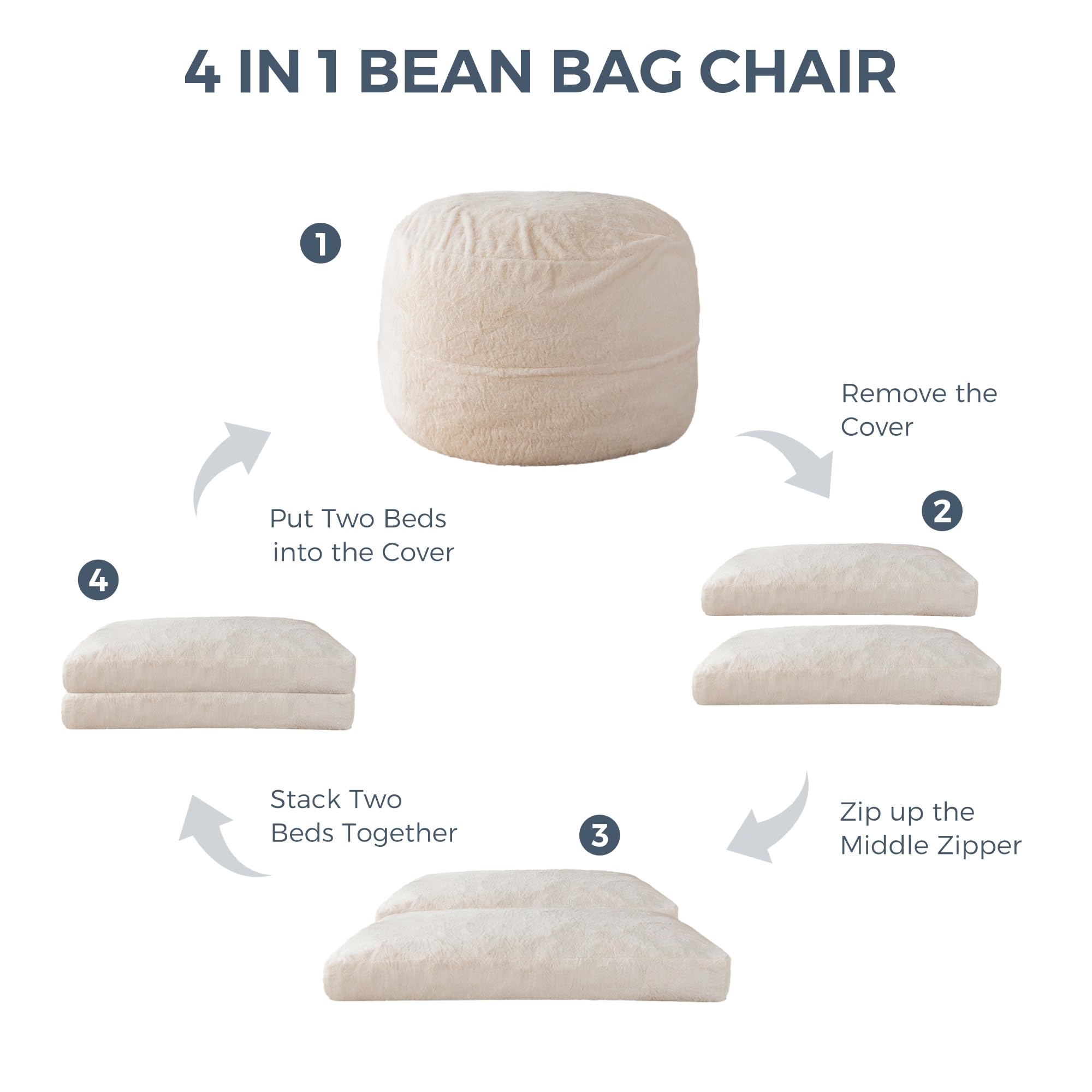 Bean Bag, or Bed? Switch Freely and Conveniently! The idea behind the bean bag bed was to take the comfort and flexibility of the bean bag chair and expand it into a larger, more accommodating sleeping surface. Simply remove the cover and flip the inner cushion to turn it into a bed. Fold and slide into cover to convert back to a chair. So easy, the kids can do it! The bean bag maintains a comfortable and flat shape, ensuring a good night's sleep without waking up with neck pain.