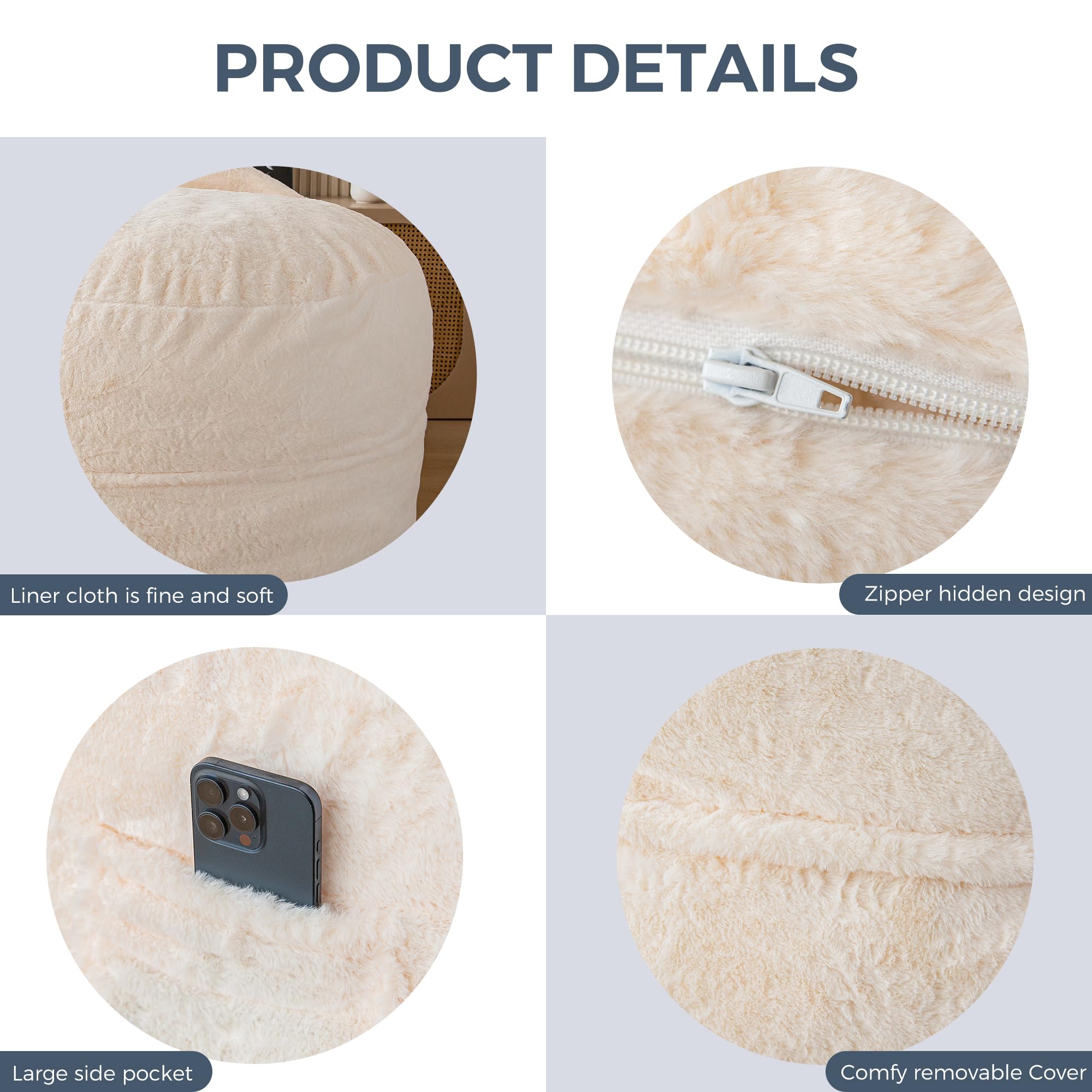 Thoughtful Details and Multiple Uses: The design of these bean bag bed includes a hidden zipper, it doesn't affect the chair's beautiful appearance. Additionally, a large side pocket is incorporated to conveniently hold mobile phones, tablets, books, and small items. The chair also features a large handle, making it easy to move around and enjoy your personal time in any corner of the house.