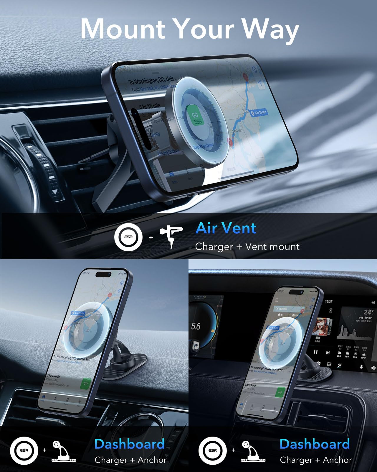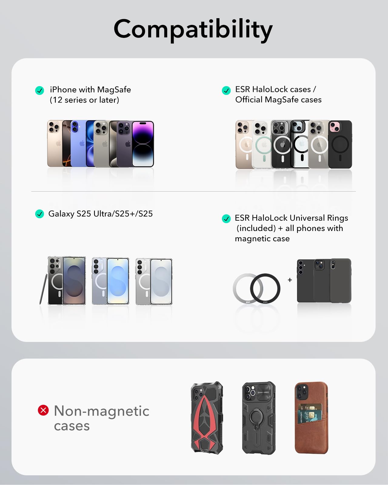 Ultra-Strong Magnets: high-grade N52H magnets with a holding force of 2,300 g keep your phone securely in place; combine with ESR HaloLock case for the strongest magnetic lock; ❌Wireless Charging Not Supported