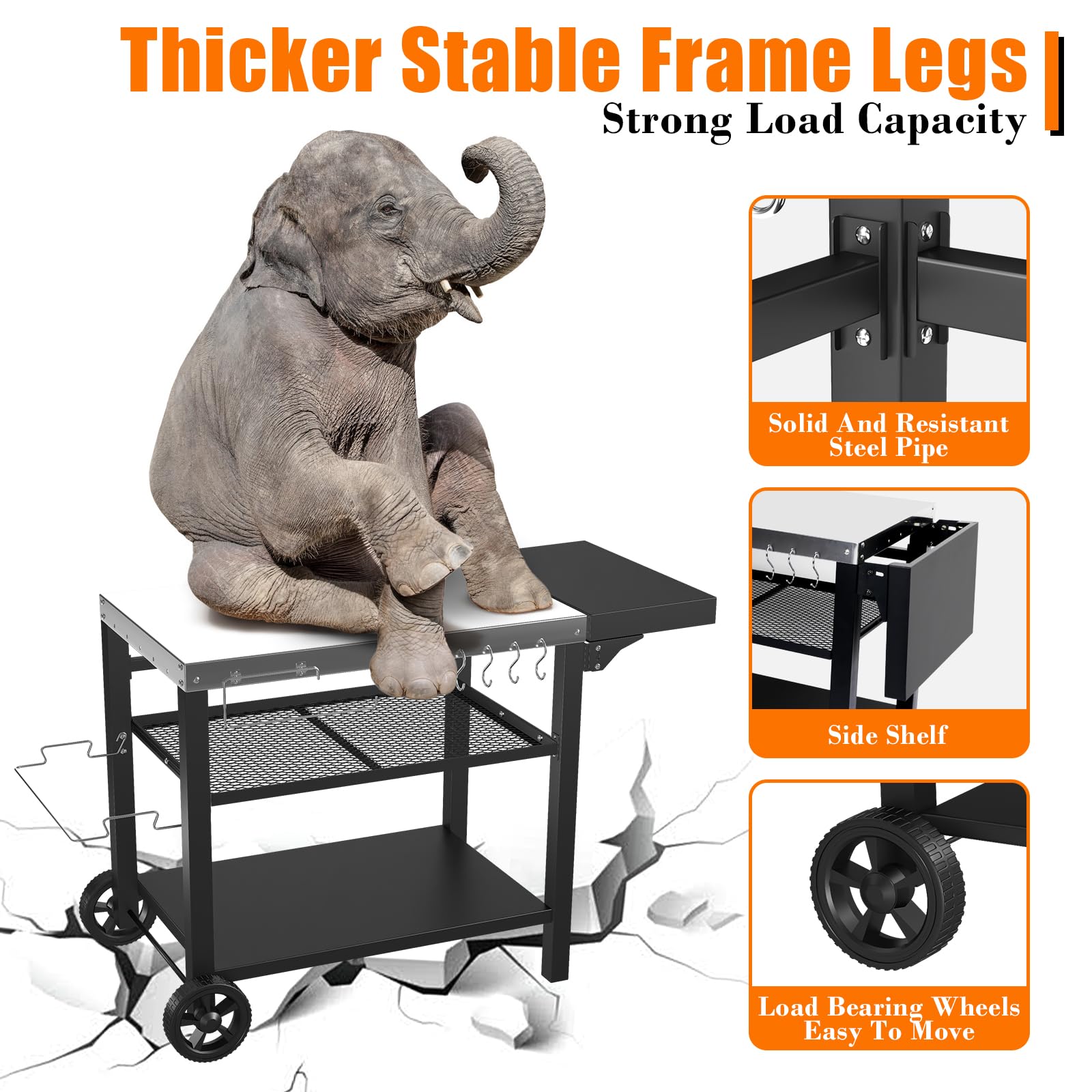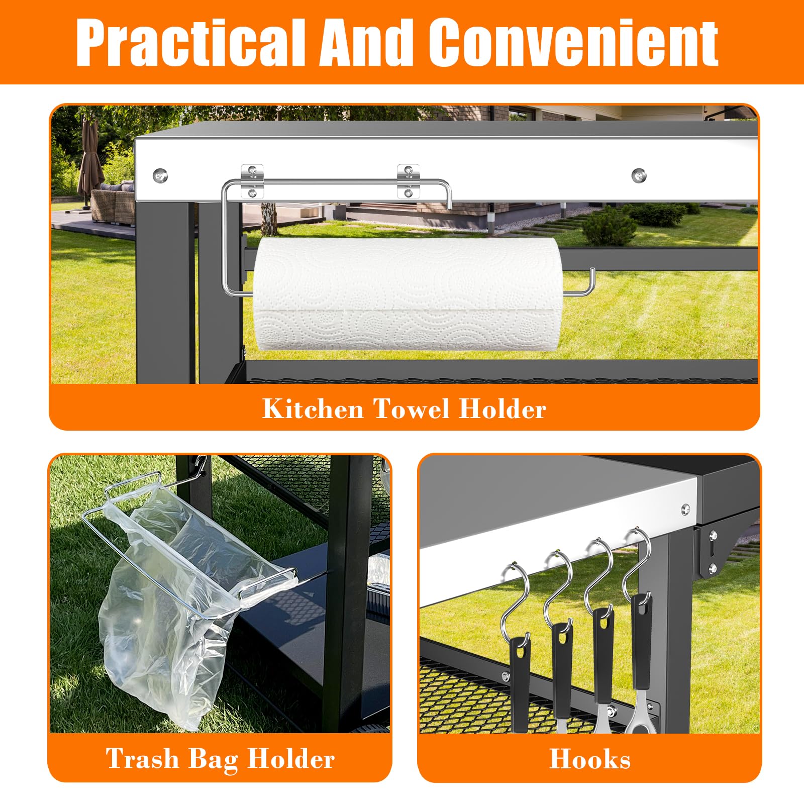 【Practical Food Prep Table】The outdoor grill stand has everything you need to griddle like a pro.Foldable side table to add additional workplace.Trash bag holder can store garbage at any time,4 hooks to hang your tongs, grill forks, spatulas.Also have a paper towel hold.Everything is so organized.