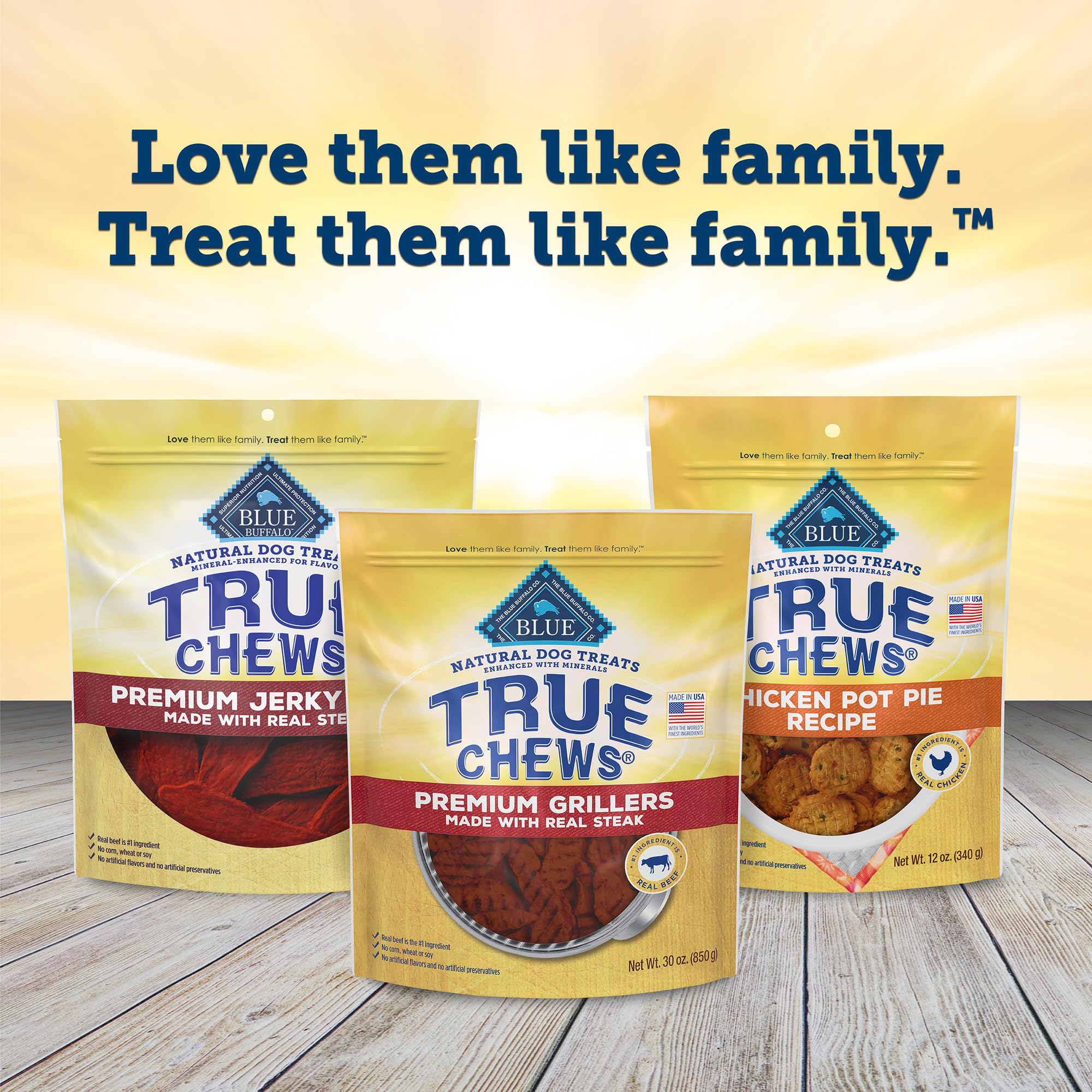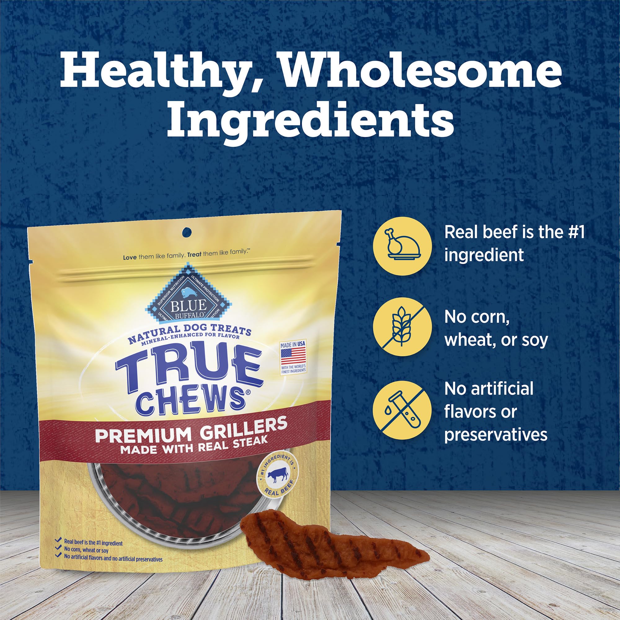 Contains: One (1) 20-oz bag of BLUE True Chews Natural Premium Grillers Dog Treats, Steak Recipe
