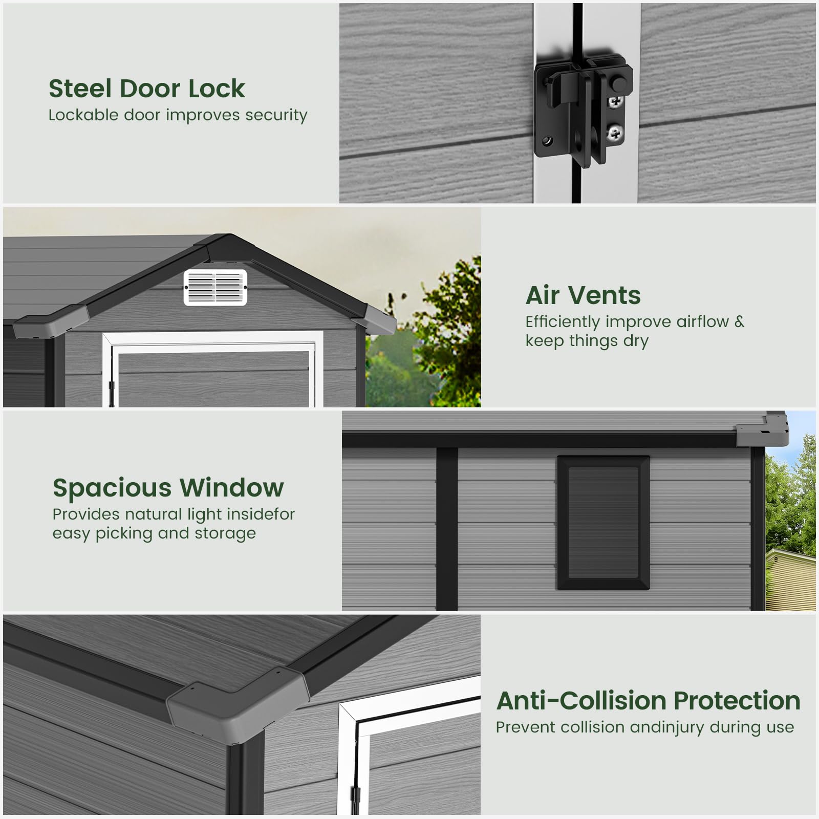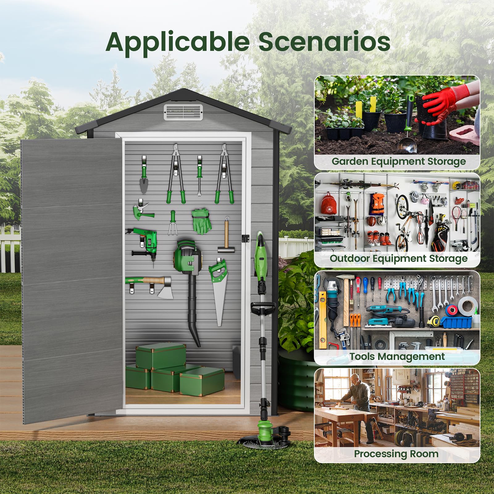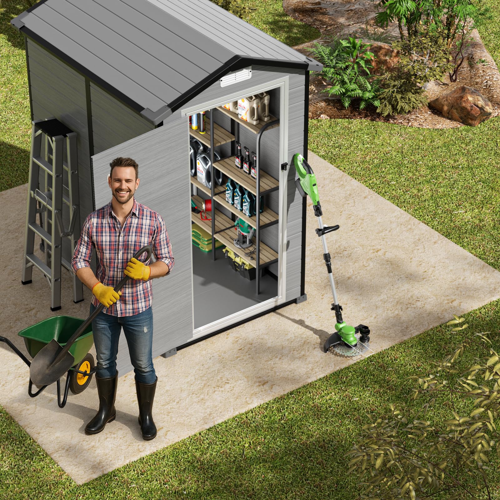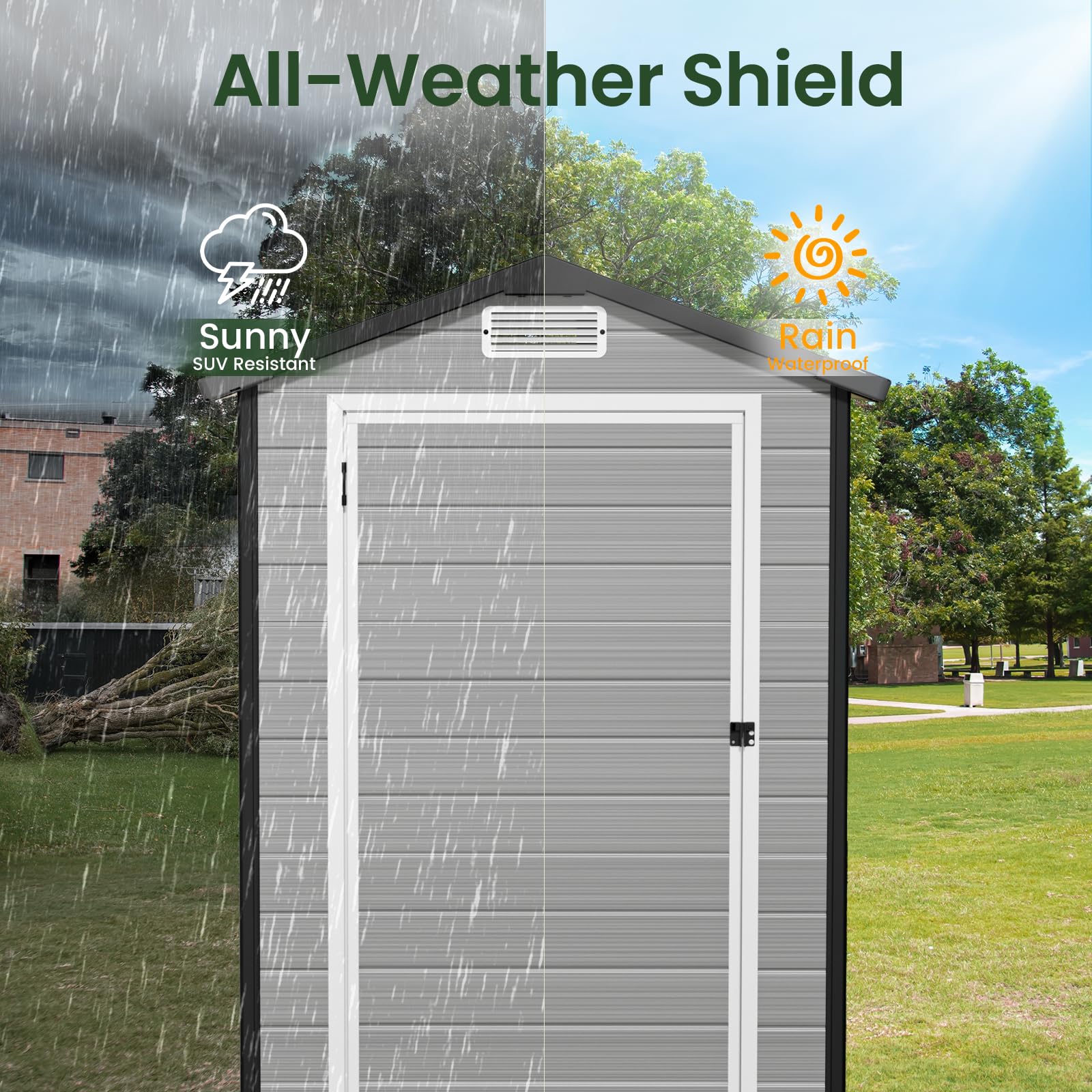 All-Weather Shed - The GVDV garden shed with floor is made using high-grade thermoplastic resin to achieve long-lasting durability; The 12mm thick double-wall resin panels are resistant to warping and cracking; Its corrosion resistance, waterproofing, and UV resistance make the shed suitable for various weather conditions; The fade-resistant materials promote a long lifespan and low maintenance costs