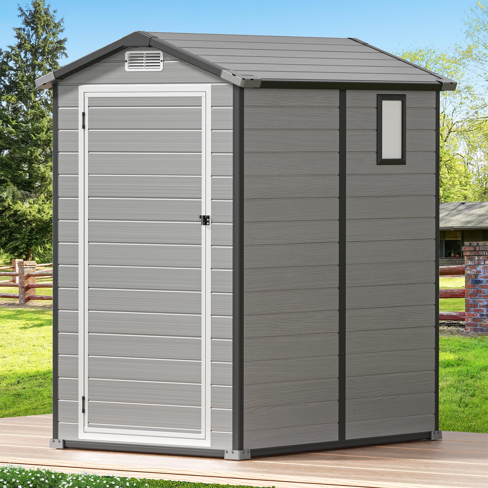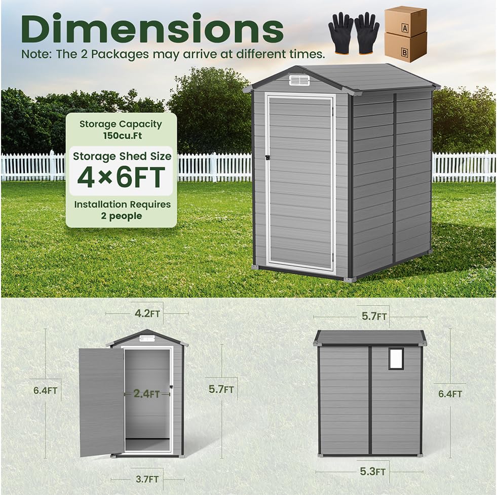 Spacious & Secure Storage: Our upgraded GVDV resin shed is designed for practicality and durability: Roof Dimensions: 4.2'Lx5.7'W×6.4'H – Providing ample coverage for stored items. Base Dimensions: 3.7'Lx5.3'W×6.4'H– Optimized for stability and compatibility with standard outdoor spaces