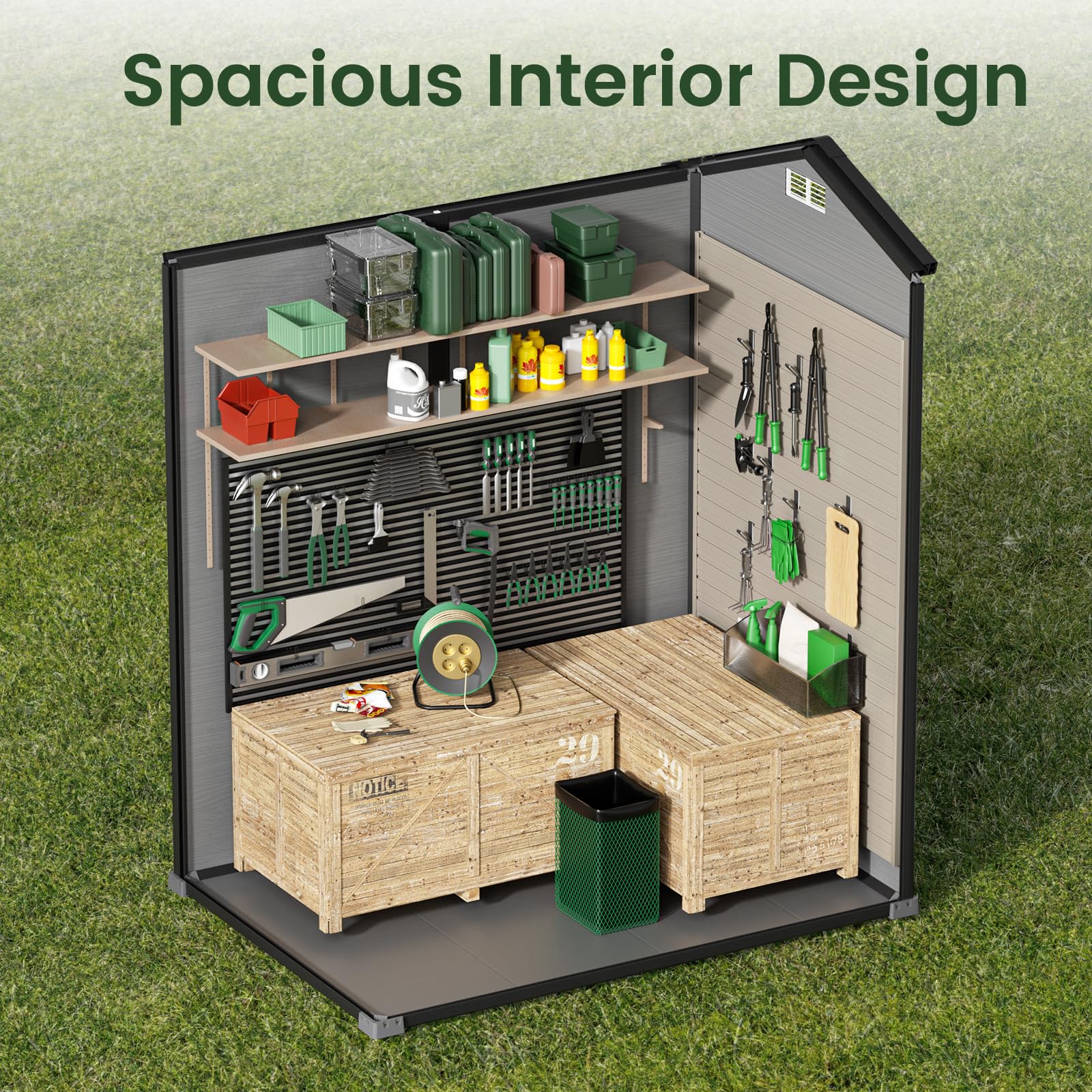 This versatile outdoor storage shed accommodates everything from garden tools to recreational gear and seasonal items. Keep your backyard tidy and organized by stowing tools, lawn equipment, or even your kids’ toy car securely. Also functions as a comfortable shelter for pets or a greenhouse for growing plants