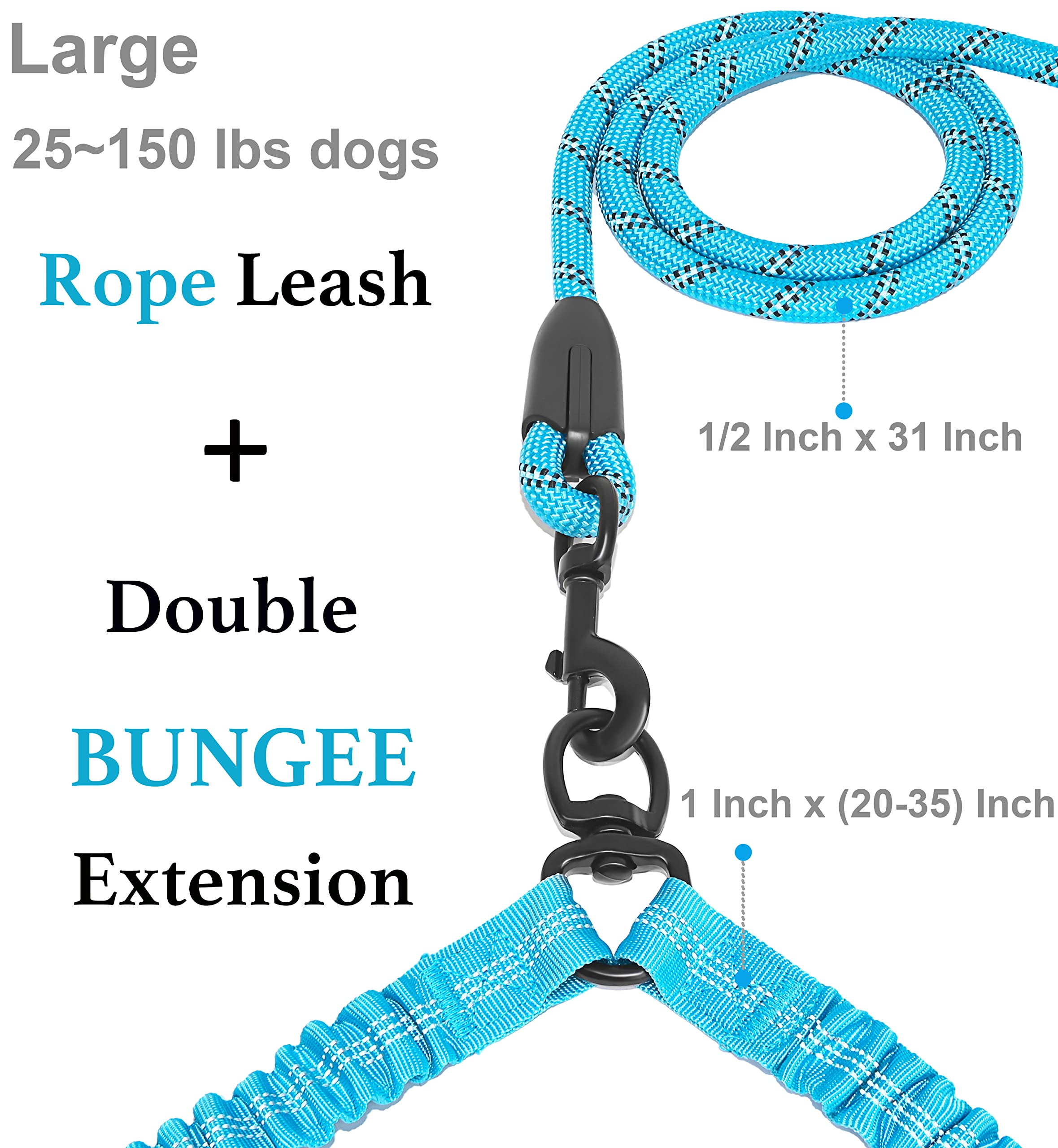 The iYoShop Double Dog Leash Advantage: 31 inch rope leash + double bungee extension (20 inches - 35 inches)