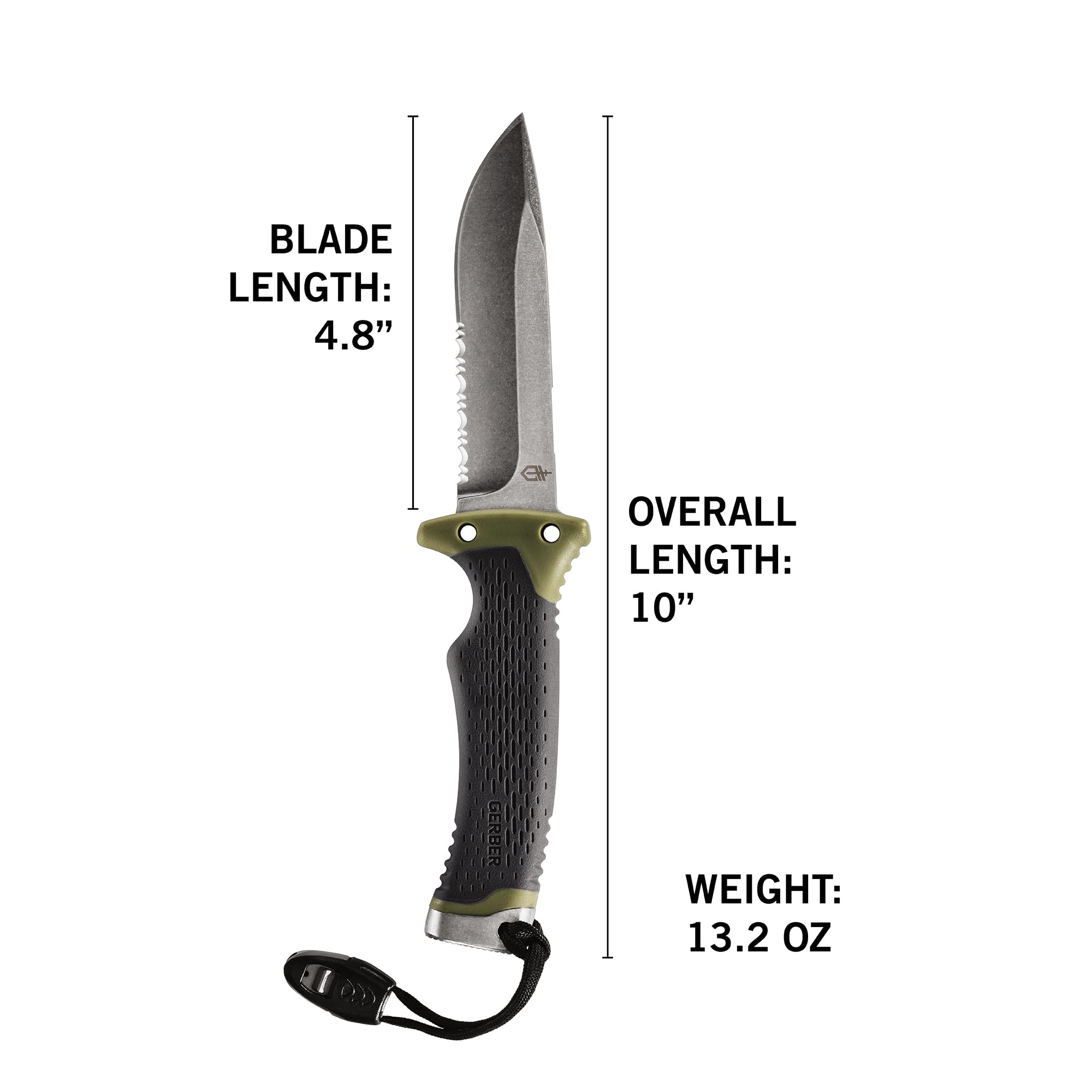COMPACT AND CONVENIENT: 4.8" blade length, 10" overall length and 11.02 oz weight make the Gerber Ultimate Survival knife an essential addition to your hunting gear and outdoor tool collection