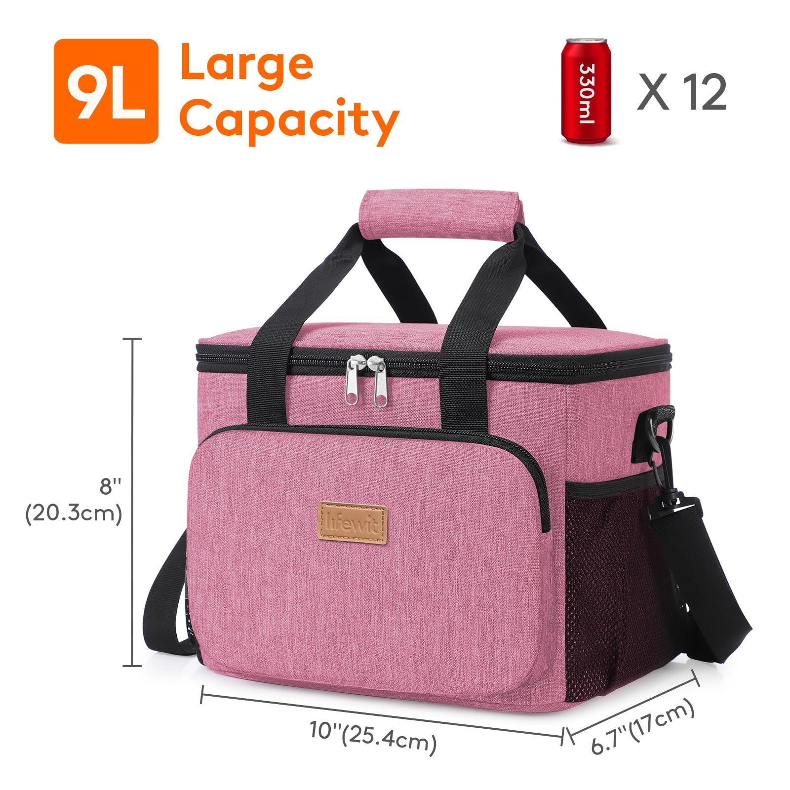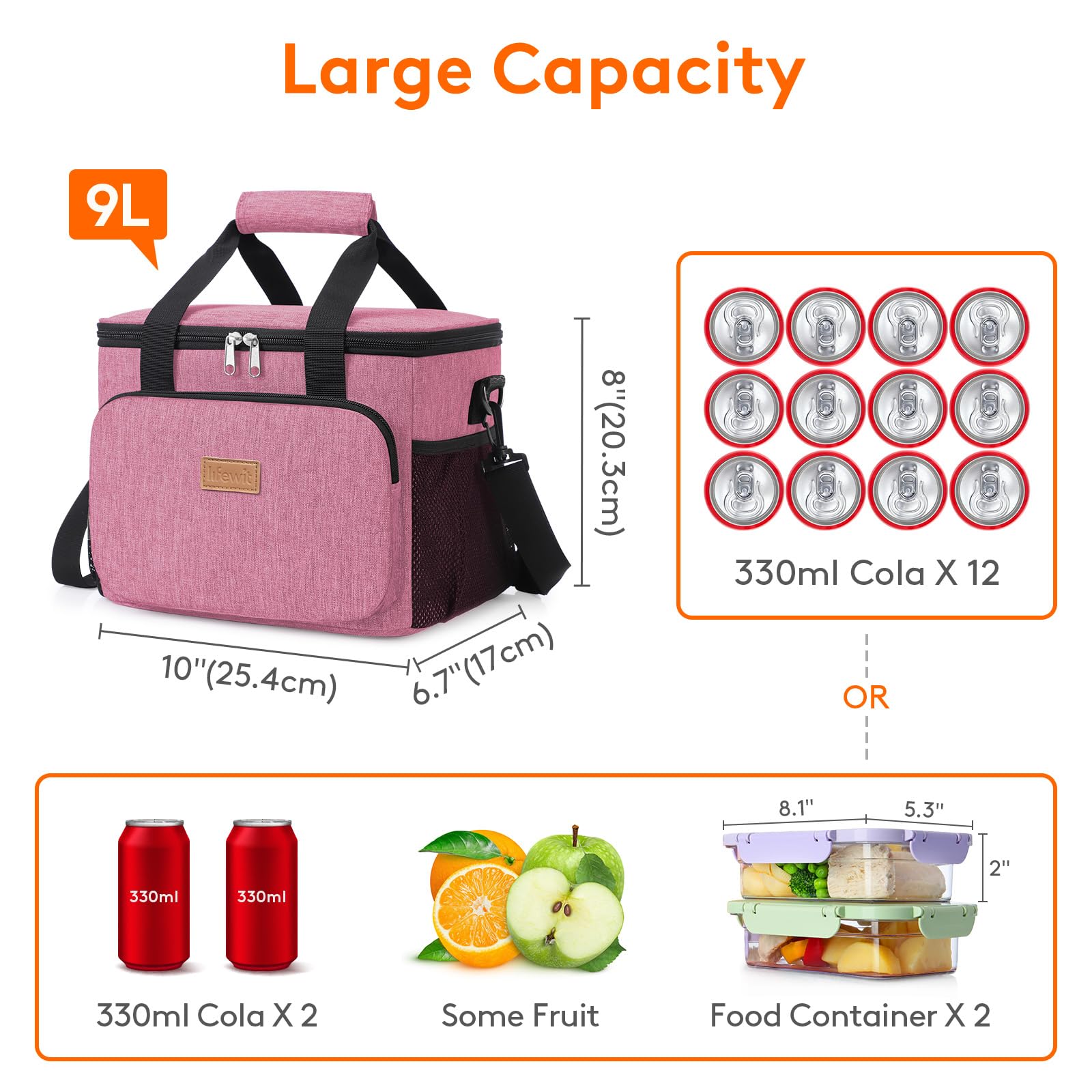 Large Capacity: Dimensions - 10" ( 25.4cm ) × 6.7" ( 17cm ) × 8" ( 20.3cm ). The maximum capacity of lunchbox for adults is 9L, and is spacious enough to store 12 cans of coke (330ml), or your lunch such as sandwiches, salad, snacks, drinks and fruits and so on. It is suitable for office, for work, picnic, beach, trip.
