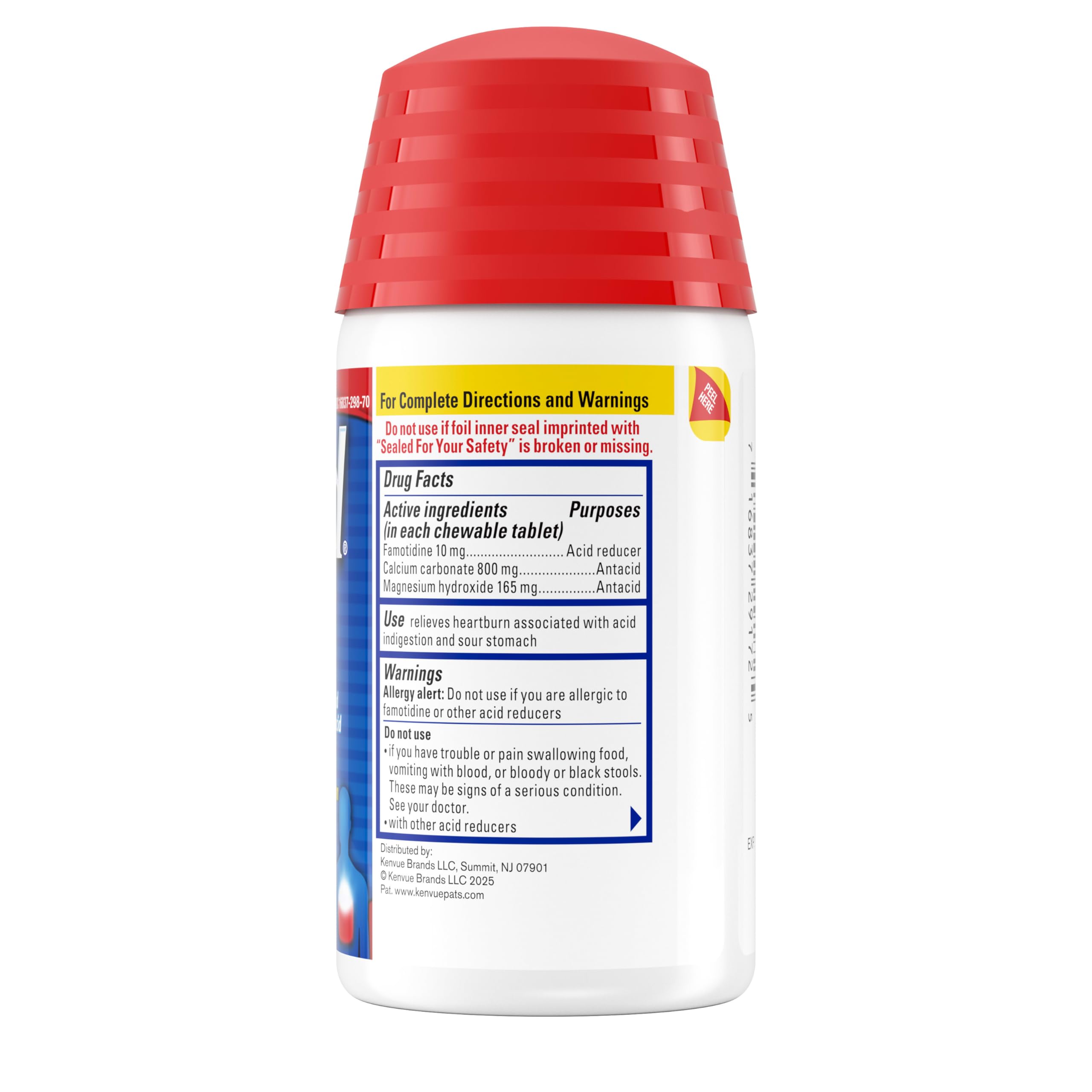 Quickly relieve heartburn & reduce acid associated with acid indigestion & sour stomach with Pepcid Complete Acid Reducer + Antacid Chewable Tablets. These berry flavored heartburn medicine + antacid chews combine a fast-working antacid & long-lasting acid reducer to help control acid all day or night.* Formulated with 10 mg of the acid reducer famotidine, 800 mg of the antacid calcium carbonate & 165 mg of the antacid magnesium hydroxide per tablet, this heartburn reliever helps to neutralize & control acid. The dual-action formula of these antacid chews starts working instantly & lasts longer than Tums.*† Whether at brunch or a new food spot, use Pepcid Complete Berry Flavored Chews for fast-acting heartburn relief so you don't have to worry about heartburn getting in the way. * Based on 9-hour acid control studies during the day & 12-hour acid control studies during the night. Acid control does not imply symptom relief. *† Tums is a registered trademark of Haleon.