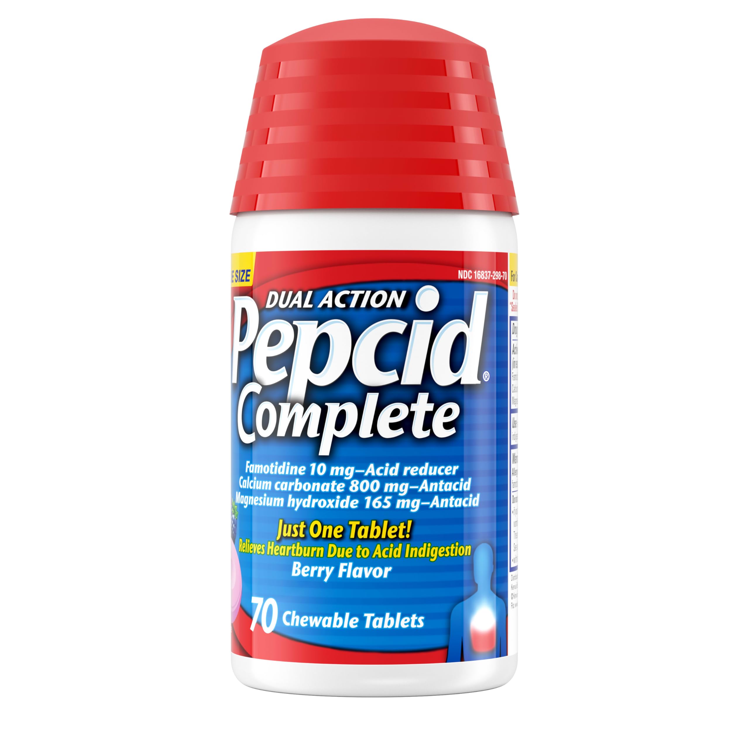 70-count bottle of Dual Action Pepcid Complete Acid Reducer + Antacid Chewable Tab-lets with famotidine in a berry flavor to help provide fast heartburn relief from acid in-digestion and sour stomach