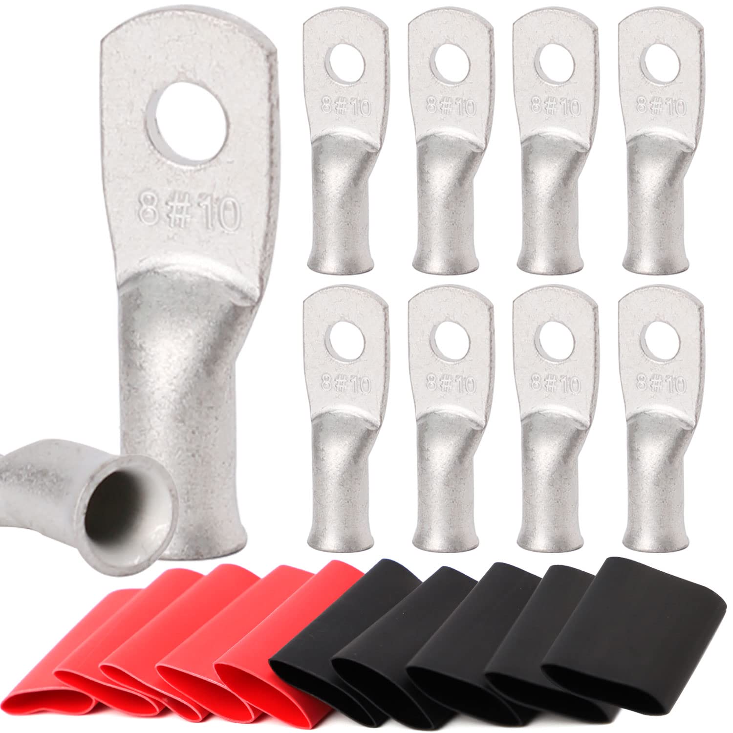 Copper Lugs and Heat Shrink Tubing Kit: 10 PCS 8 gauge (AWG) - #10 ring terminals copper wire lugs and 10 PCS 3:1 Dual Wall Adhesive Heat Shrink Tubing(5 black and 5 red), and comes with a sturdy clear plastic jar that make battery cable ends easy storage