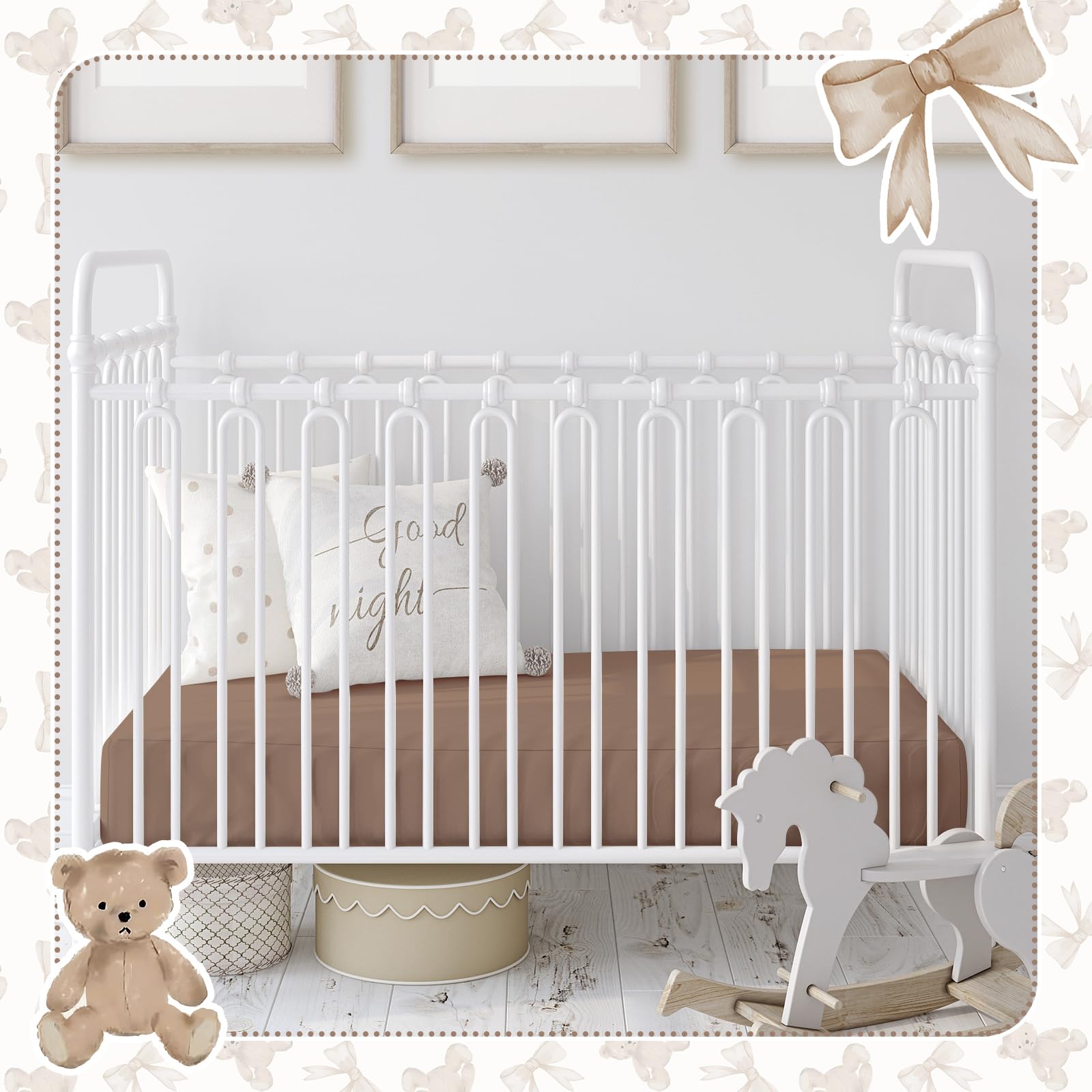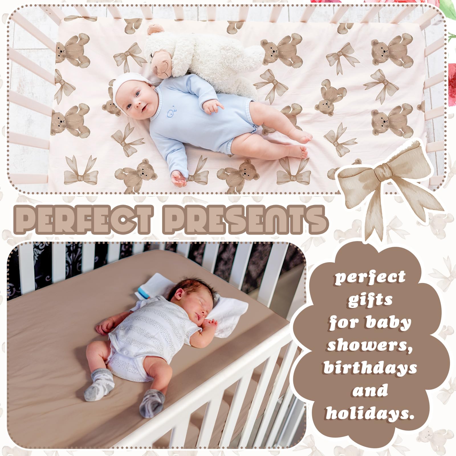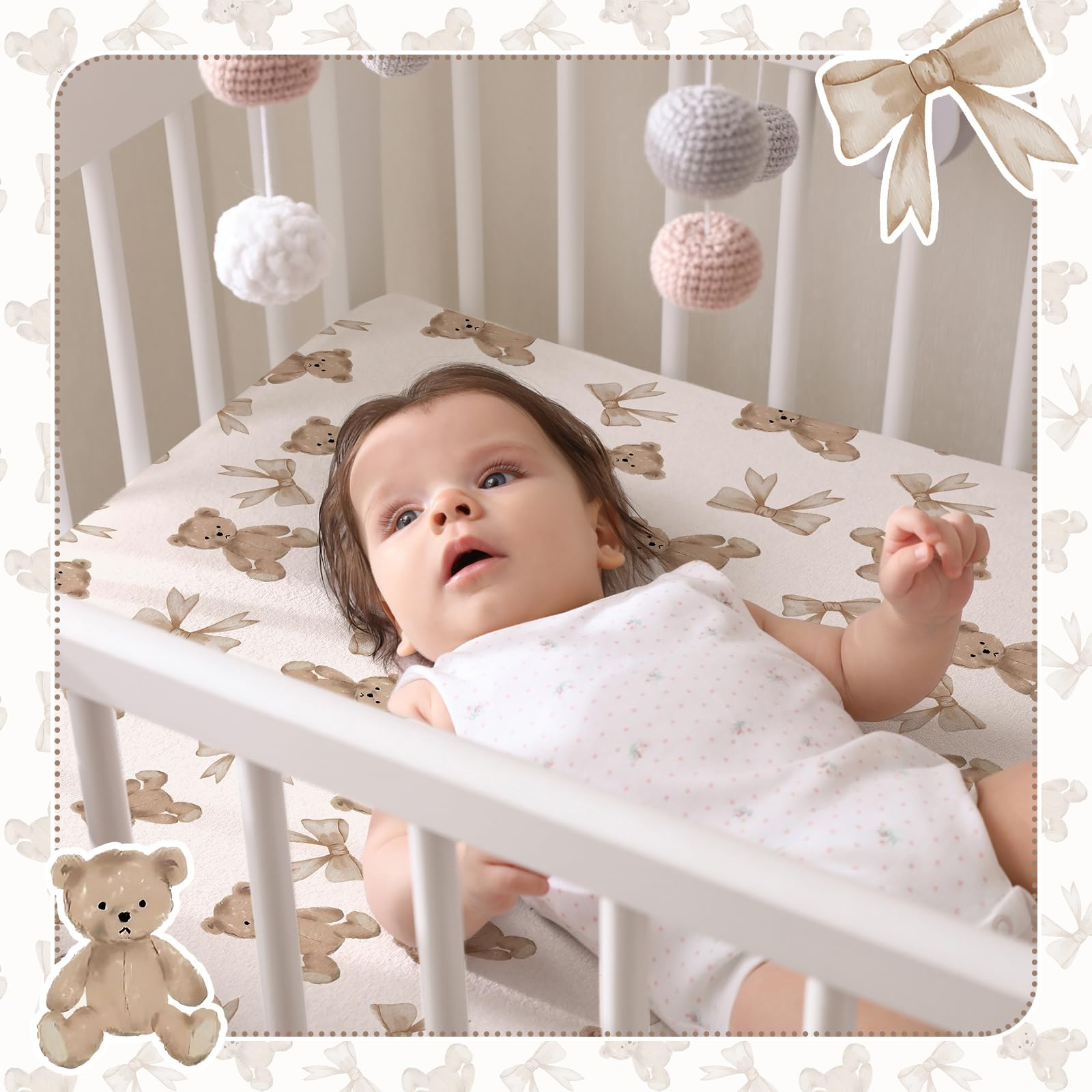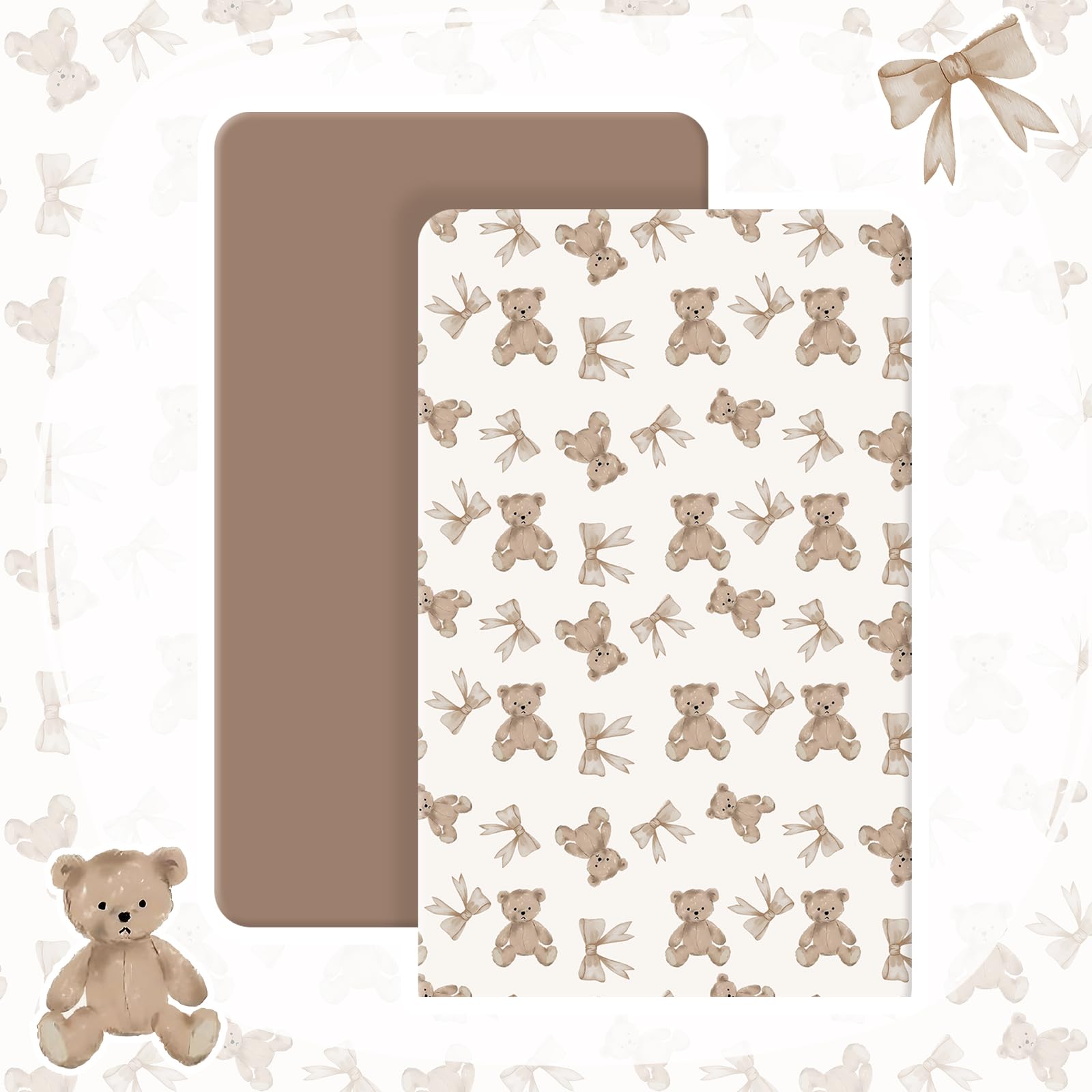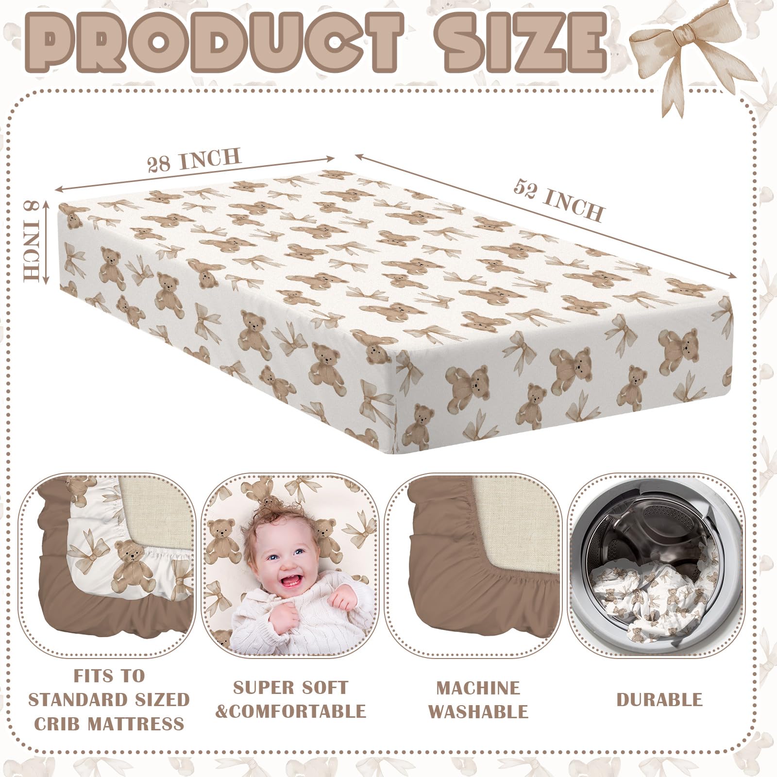 Brown Bear Bed Sheet Set: includes 2 pcs baby bed sheets compatible with a 52" x 28" standard baby mattress; 4 sided elastic edging design, paired with an 8 inch deep pocket, provides a secure fit that is not easily displaced; 2 pcs bed sheet configuration, easy to change and wash, keep clean and ready for use at any time; Practical and thoughtful, creating a comfortable and reassuring sleeping space for babies
