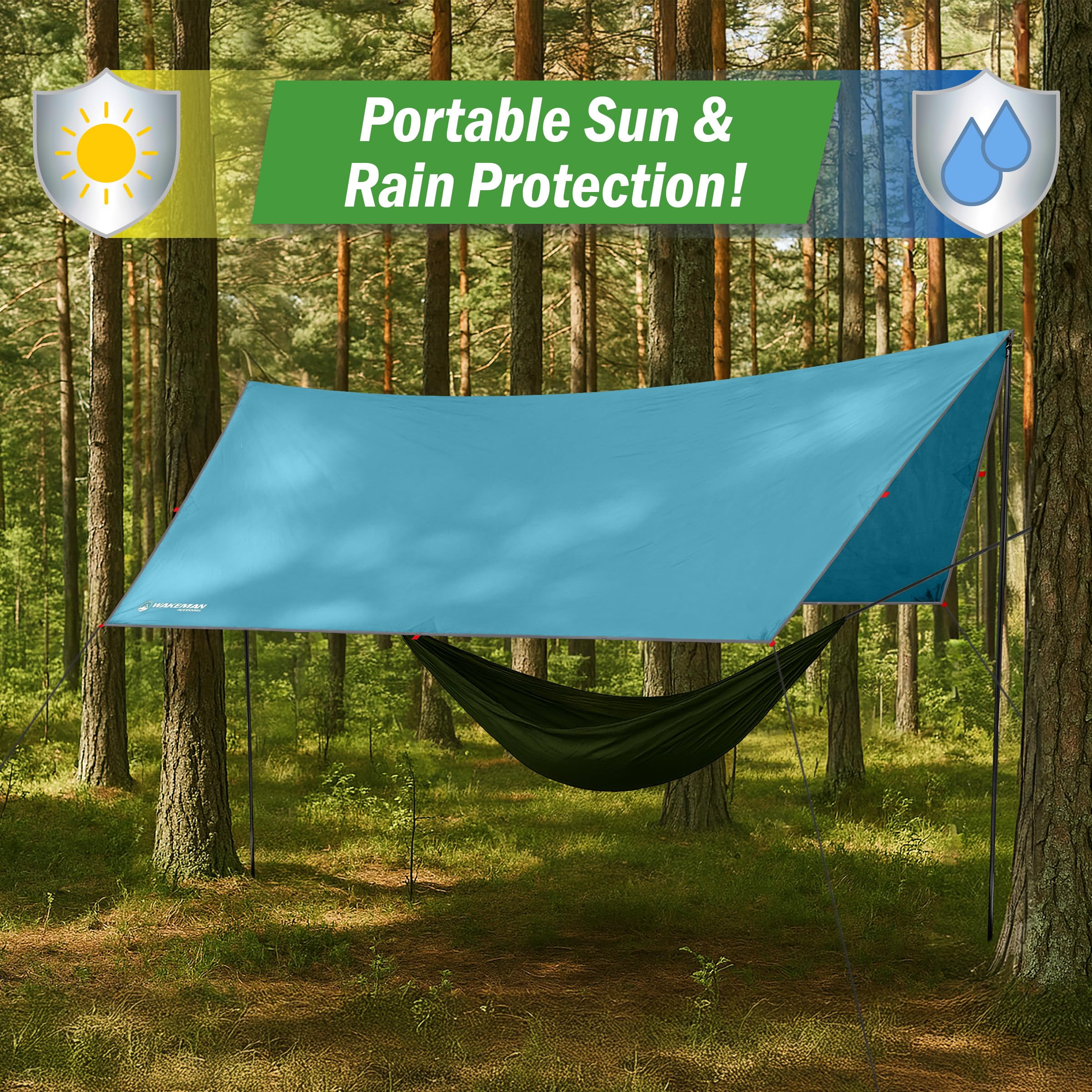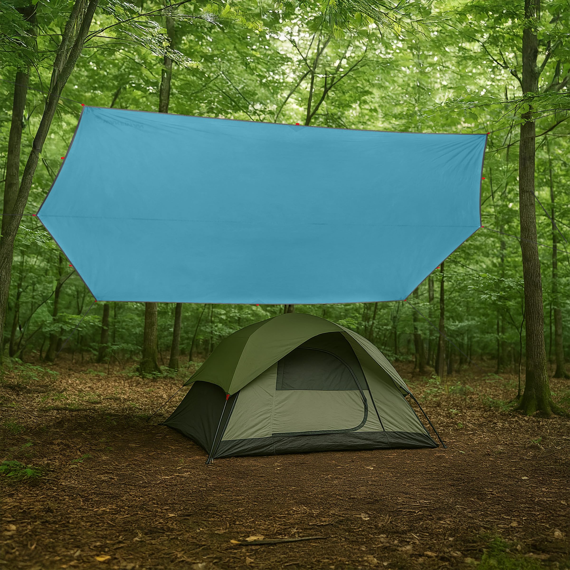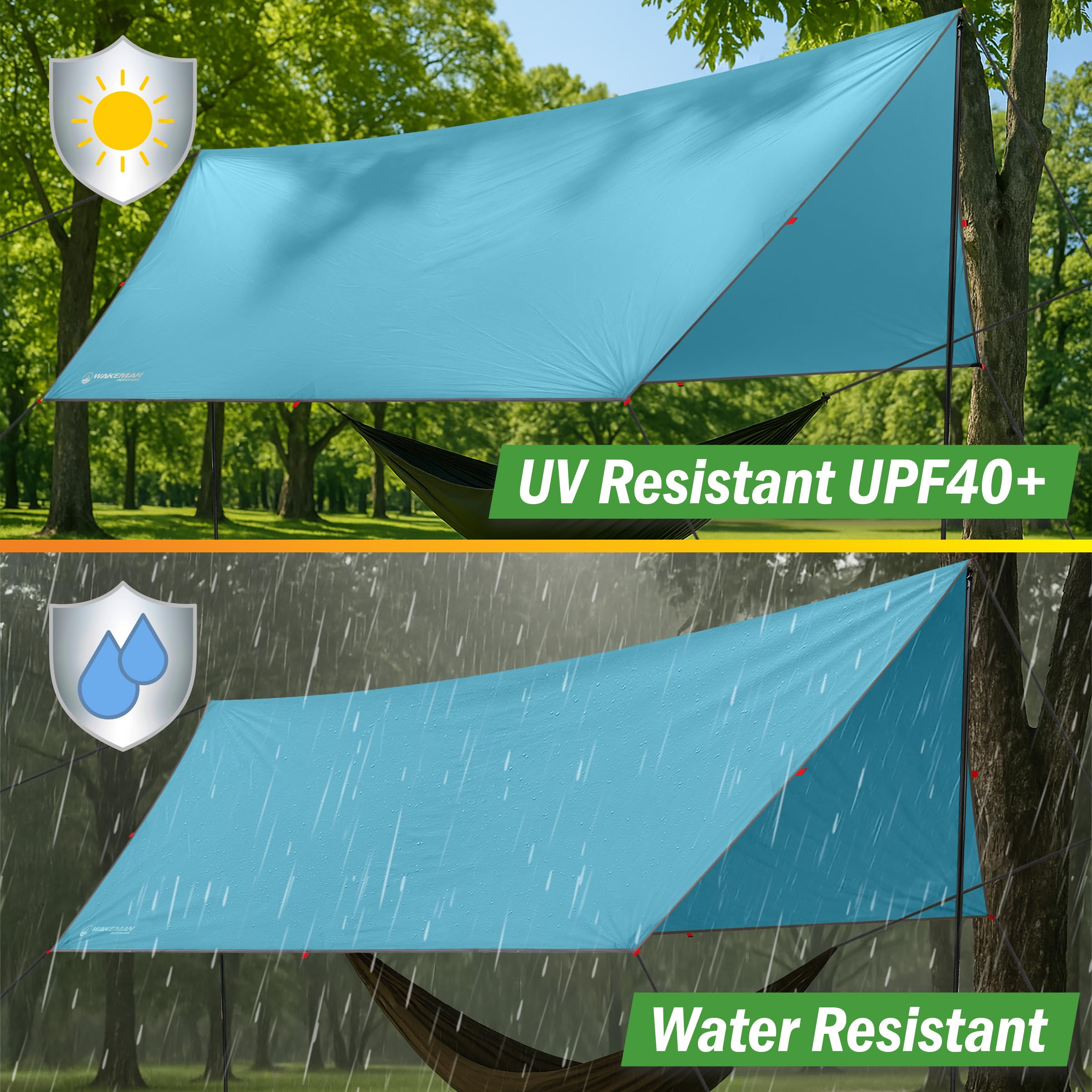 HEAVY DUTY TARP - The tent or hammock tarp is built to last from 150D ripstop oxford fabric with 3000mm PU water-resistance. Our 15x12ft camp tarp also functions as a UV tarp for sun protection, offering UPF40+ for a shady spot to lounge on a sunny day.