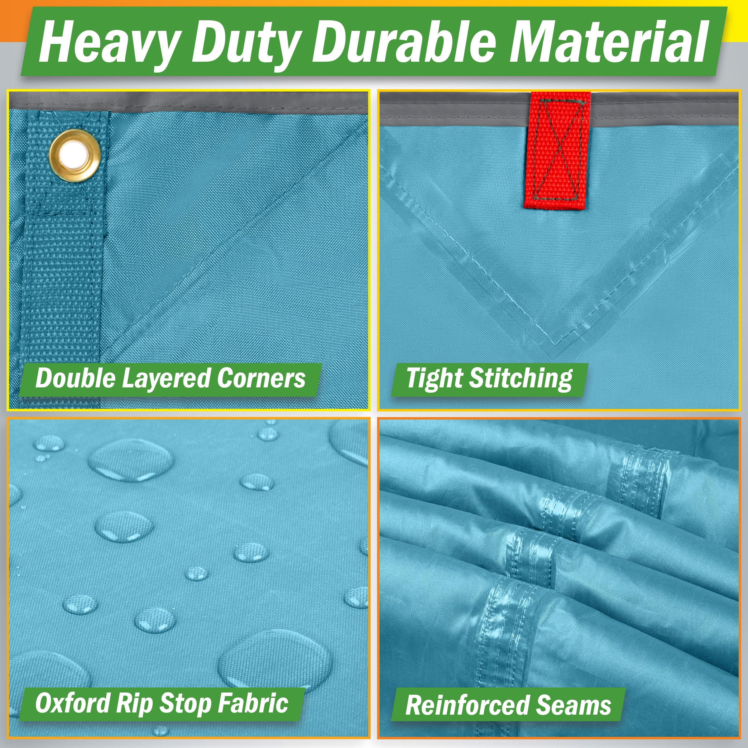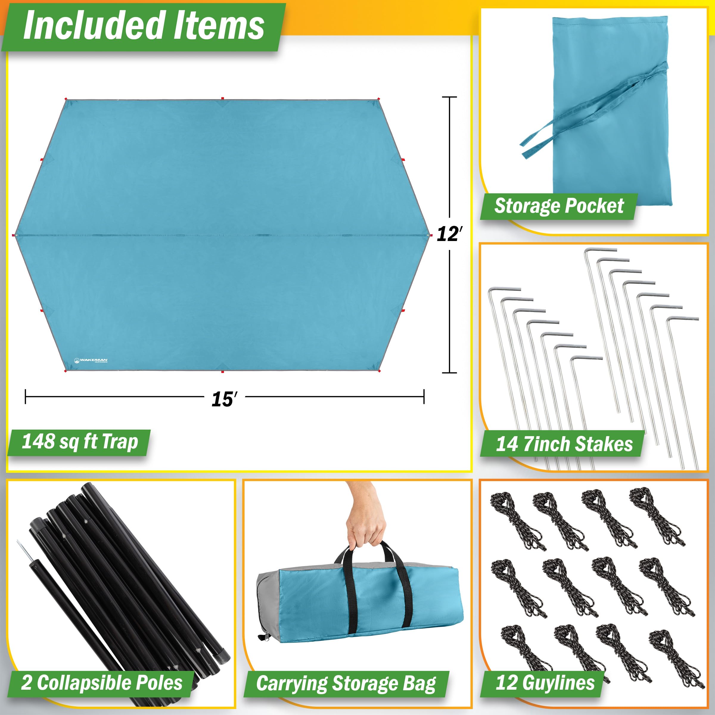 PRODUCT DETAILS - Materials: 150D Rip Stop Oxford Fabric. Dimensions: (L) 181” x (W) 116”;148sqft; Long Guy Line: 276”; Short Guy Line: (L) 118”; Bag: (L) 17.5” x (W) 6”. Includes: 15 by 12 Tarp, 14 Stakes, 12 Guy Lines, 2 Tarp Poles. Color: Blue.