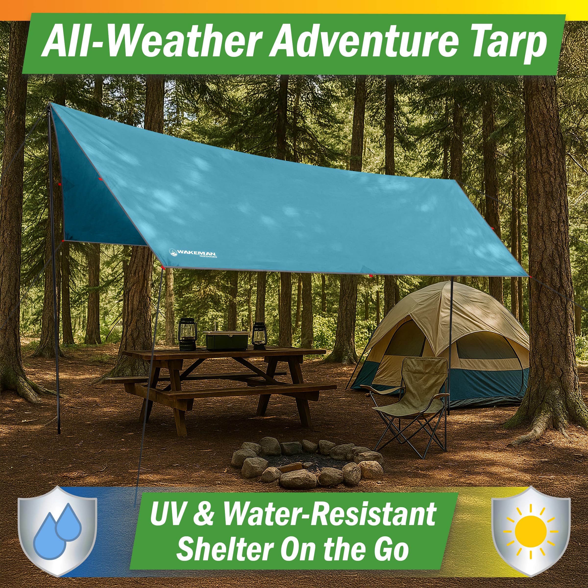 Take shelter wherever adventure takes you with Tarps for Camping by Wakeman Outdoors. This ultralight tarp measures 15 by 12 feet, but folds to a compact 17.5-inches-long by 6-inches wide to fit in the included carrying bag for portability, alongside the included stakes, tarp poles, and sturdy guy lines for easy setup near trees or other structures. Made from water-resistant rip stop oxford fabric with UPF40+ for sun protection, this tarp canopy provides shelter from the elements, whether you’re camping out or enjoying a beach day. Wakeman Outdoors is your source for heavy duty camping tarps and other camping essentials built to withstand all your outdoor adventures.