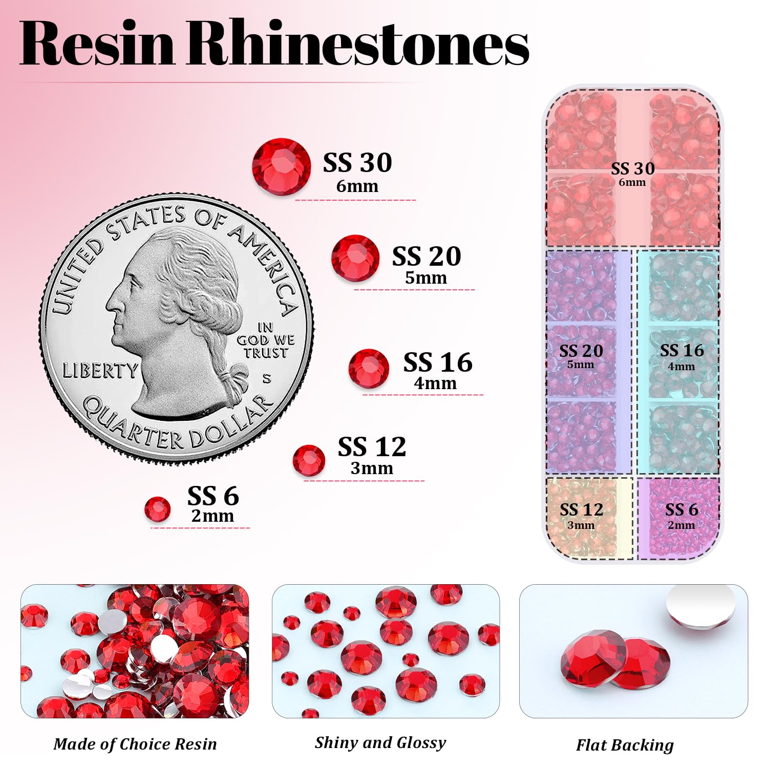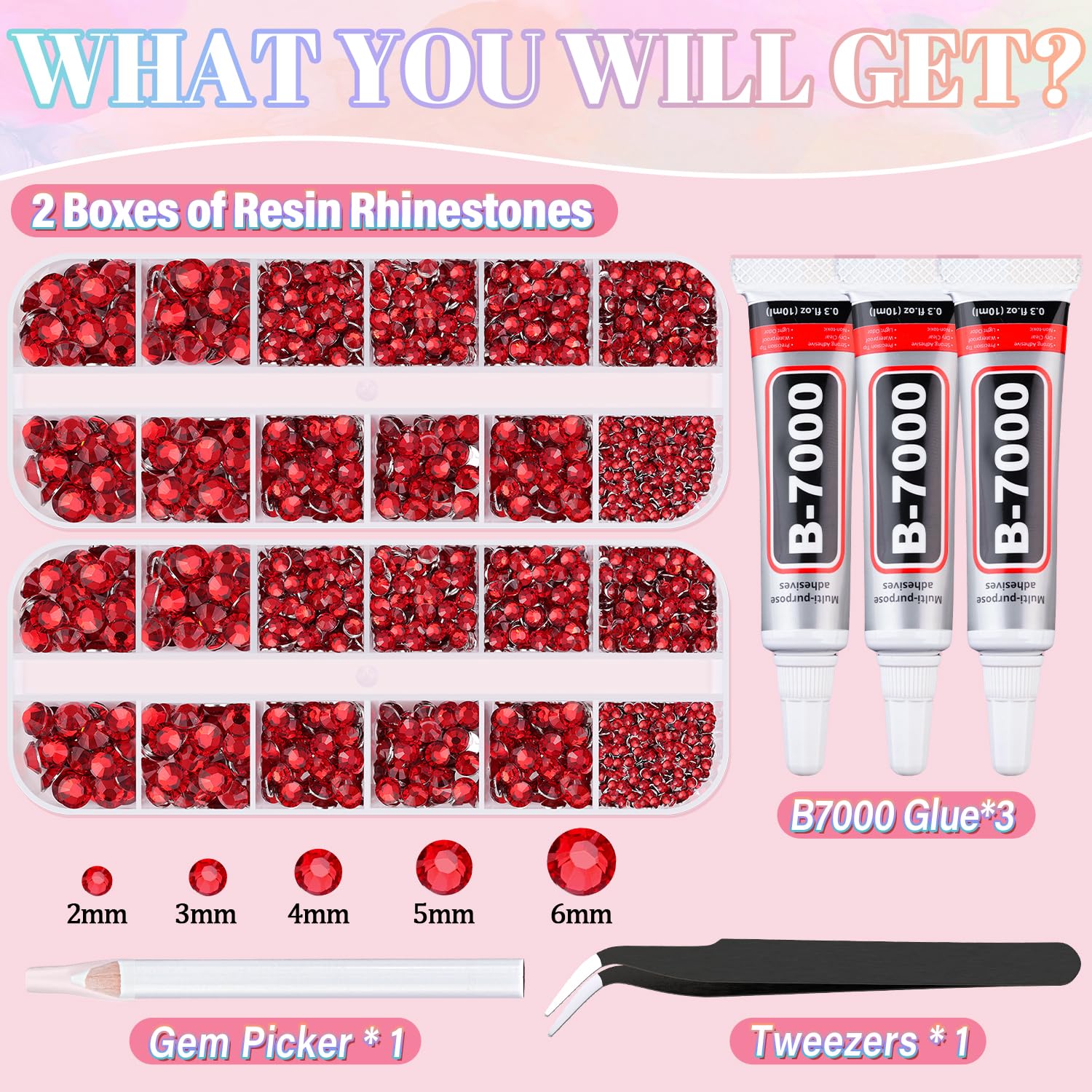 WHAT YOU WILL GET -- The package includes 2 boxes of flatback rhinestones with 12 grids in different sizes. 1 tweezers for large-size gems, 1 pickup pen for small-size gems. 3 B7000 adhesive jewels glue for jewelry making. This rhinestone kit makes it easy for you to make any craft you like, and will bedazzle your artworks! CHARMING GEMS FOR CRAFT -- These high-quality flatback bling diamonds are made of choice resin, so they are very lightweight, durable, and cost-effective. Their perfect cutting facets, delicate and exquisite shine, will make your handicrafts more dazzling and eye-catching. Our store also offers a variety of colors, which will give your crafts more possibilities. STRONG B7000 GLUE FOR GEMS -- These Non-Hotfix rhinestones are not self-adhesive and need to be used with glue. The equipped B7000 glue has strong adhesion and dries clear. It has a precision needle for easy application. For first use, you can leave the glue head up for a few minutes before opening to avoid overflow. After using, the needle needs to be cleaned with an alcohol wipe to avoid a mess. TIPS FOR USE -- Our flatback rhinestones are non-hotfix and need to be used with glue. To apply the resin rhinestones, first, clean the surface of your crafts or your nail you wish to embellish. Then, apply the rhinestones with the appropriate glue and wait for them to dry. Once the glue is completely dry, it will stick firmly to your crafts or nails, making your artwork more sparkling! WIDE APPLICATION -- These sparkling iridescent resin crystals are perfect for creating dazzling looks. Use them for bedazzling DIY crafts like shoes, tumblers, mugs, bottles, phone cases, popsockets, scrapbooks, photo frames, diamond paintings, greeting cards, bags, glasses, guitars, keychains, hats, masks, hair clips, bracelets, wristbands, clothing, wedding dresses, and more.