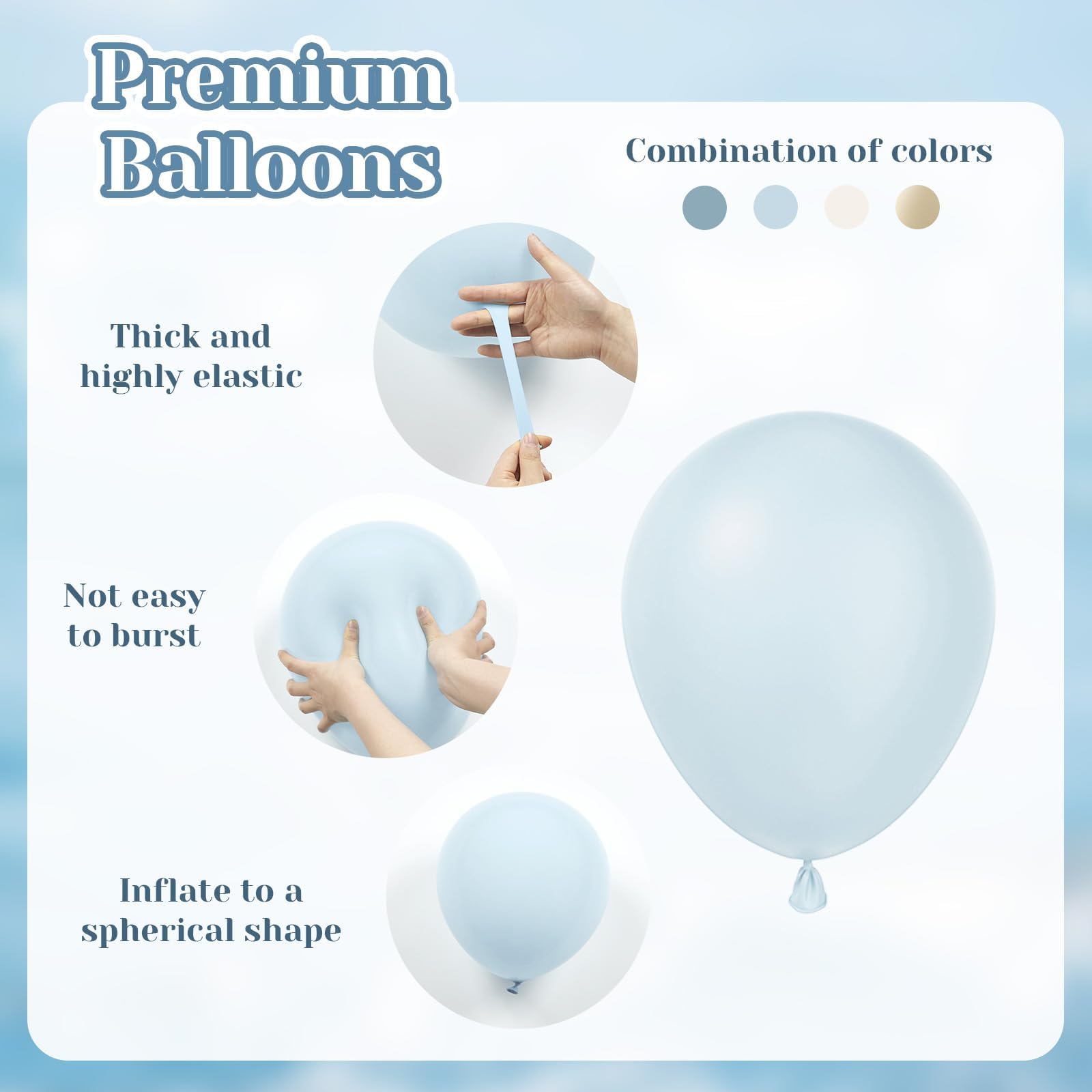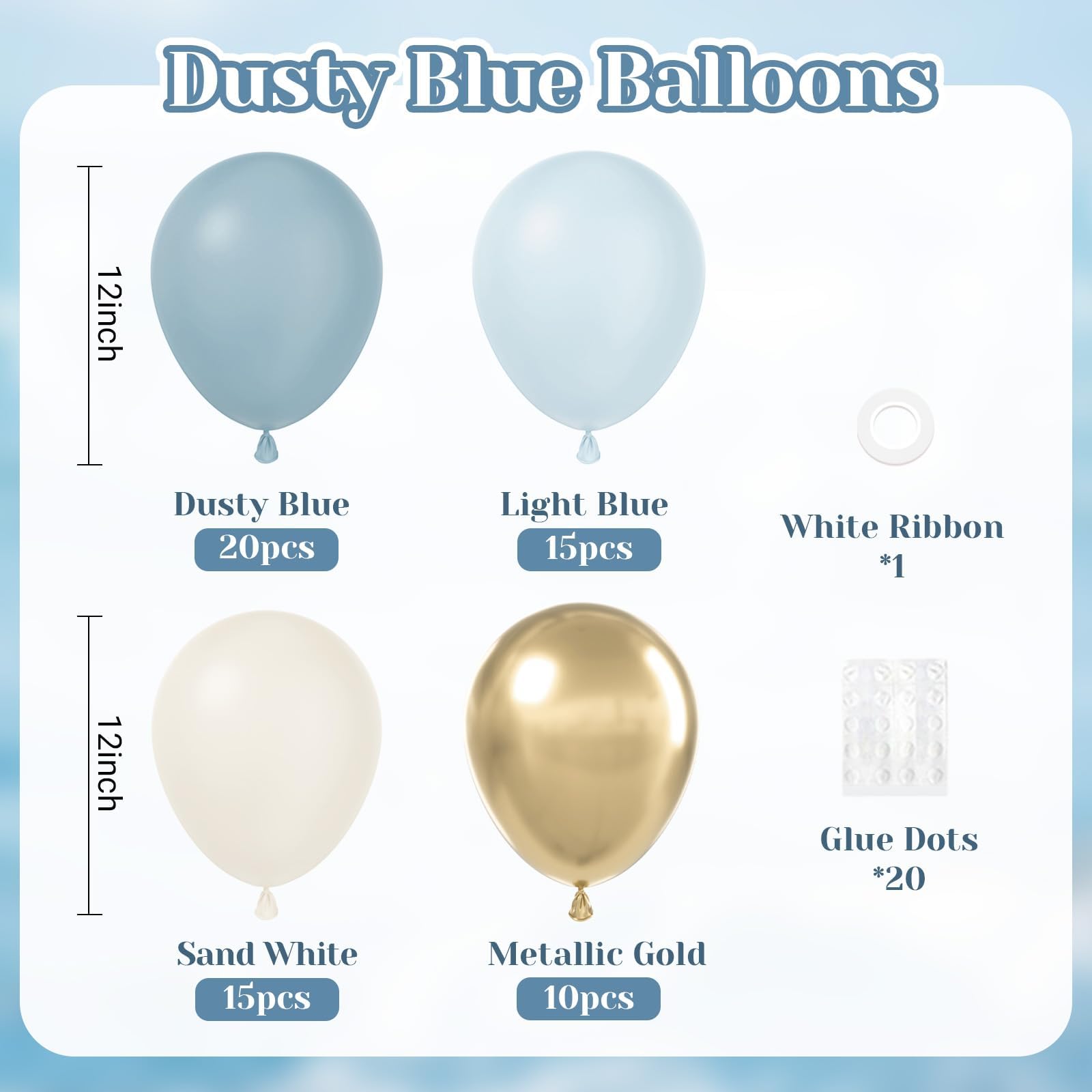 Package Included: The blue gold balloons include 12inch dusty blue balloonsx20, 12inch light blue balloonsx15, 12inch sand white balloonsx15, 12inch metallic gold balloonsx10, ribbon x1, glue dots x20