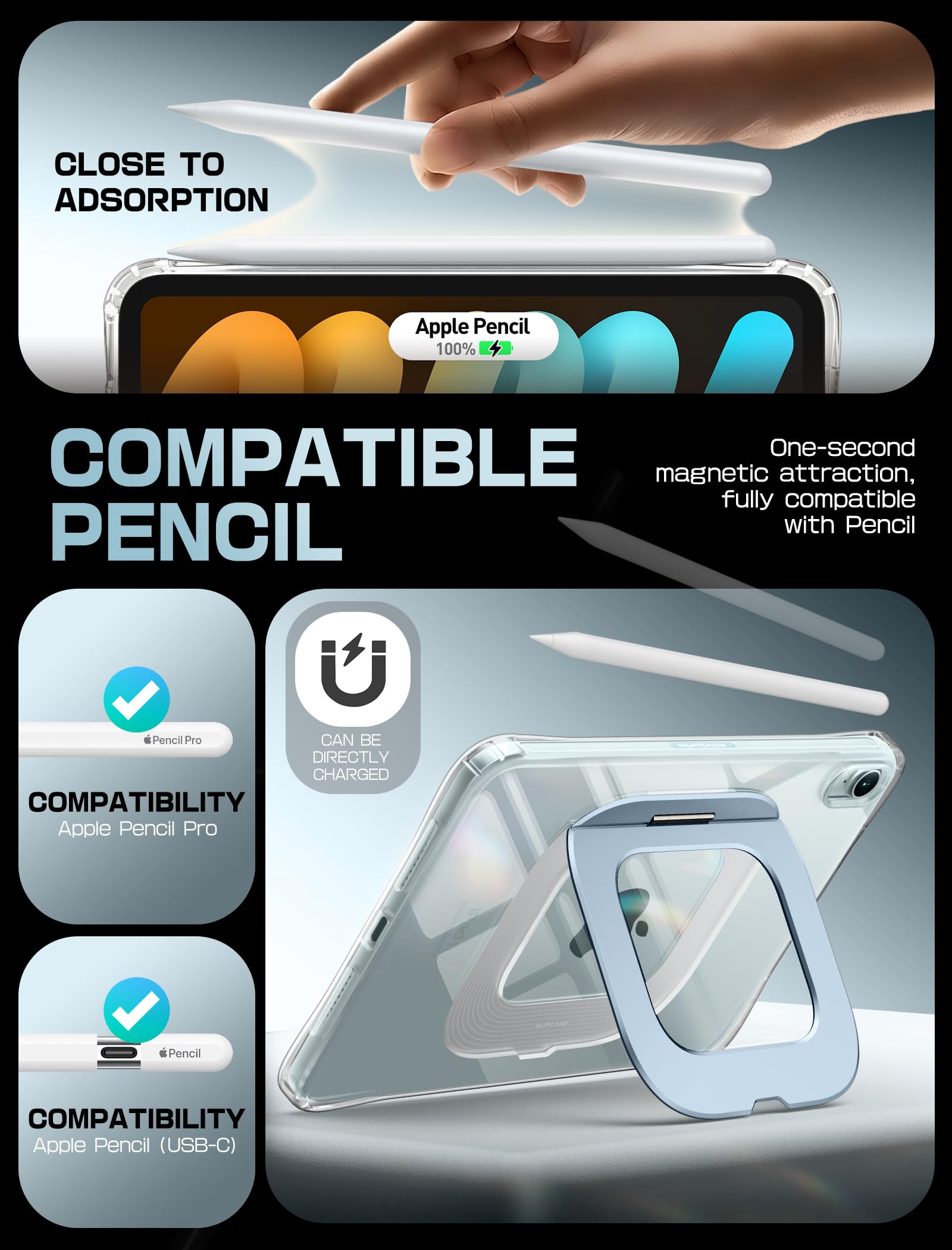 Compatible with Apple Pencil 2/Apple Pencil Pro – Wireless charge Apple Pencil uninterruptly. Also supports Apple Pencil (USB-C) with full magnetic adhesion (Note: USB-C model does not support charging via case)