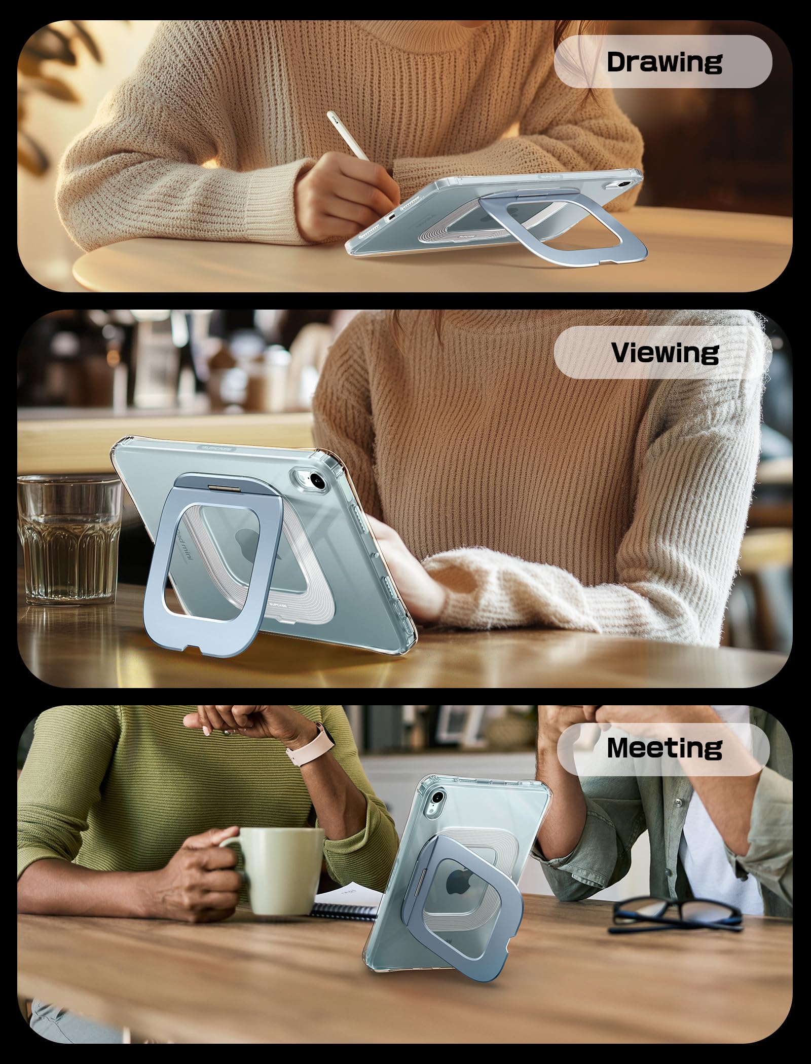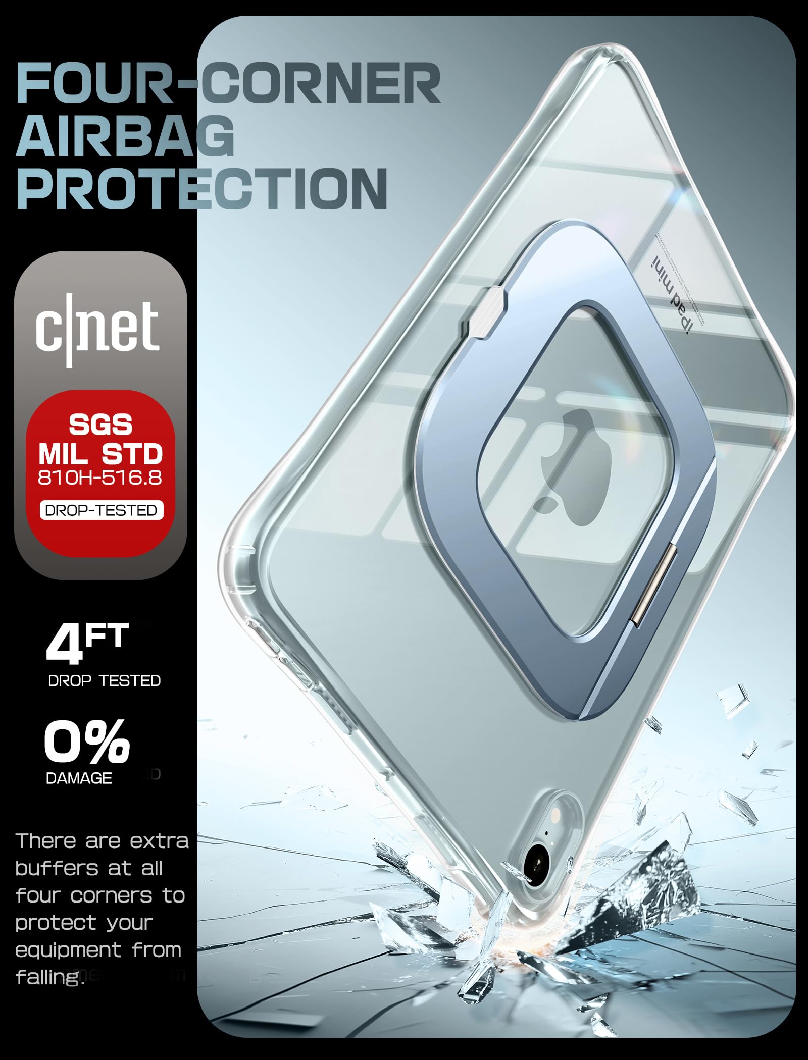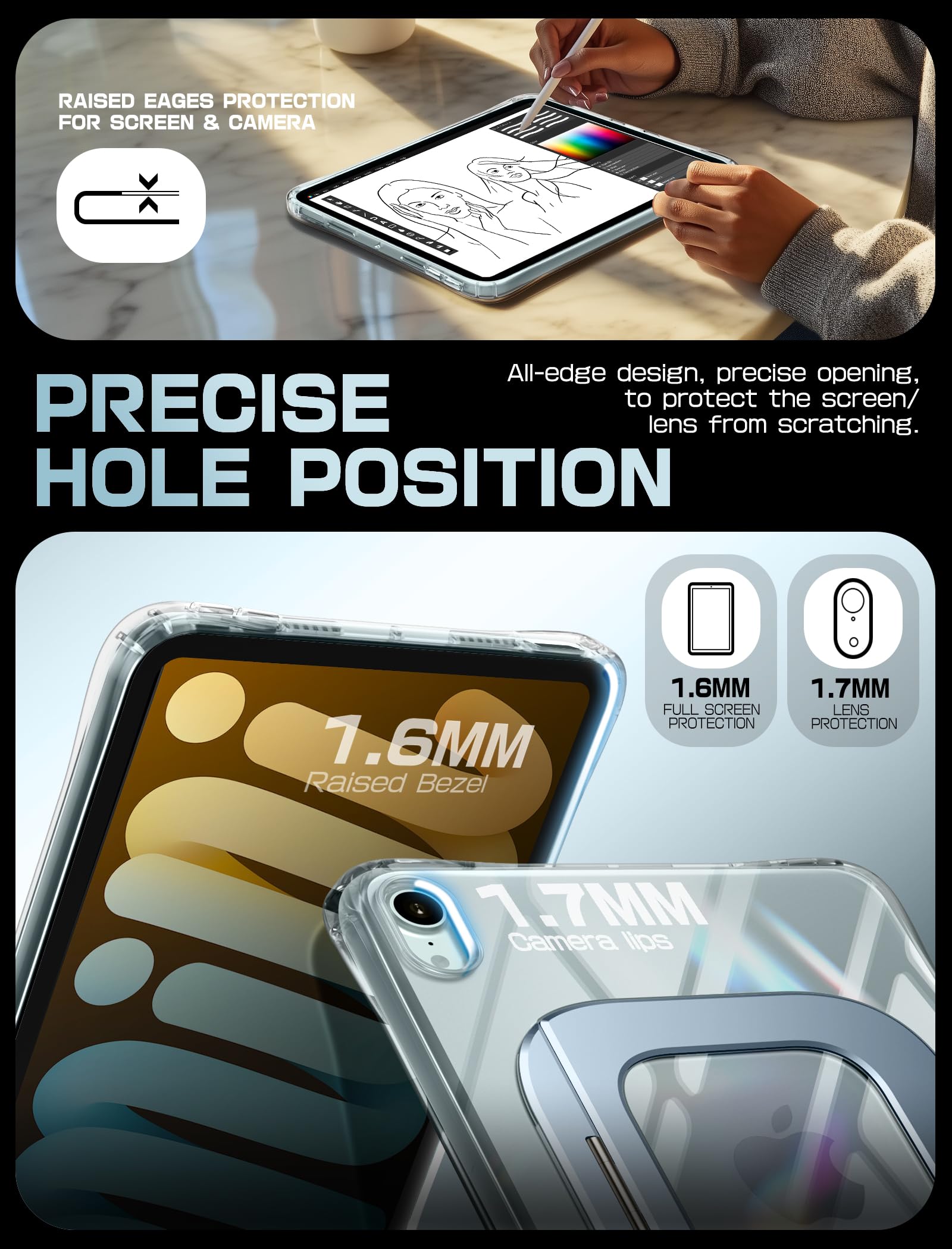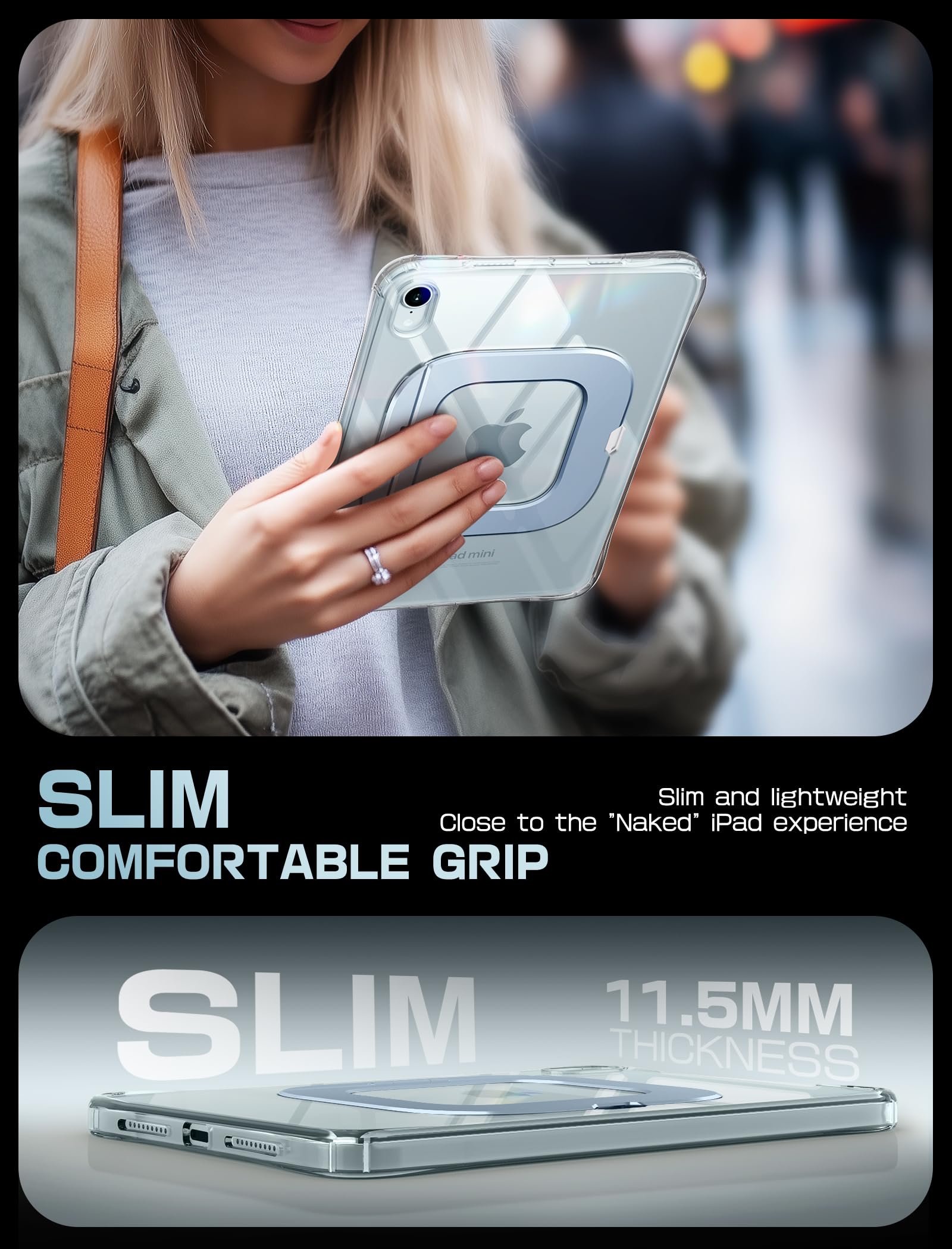 Ultra-slim & lightweight design – The ergonomic curved edges and feather-light 118g weight 11.5mm back thickness make holding your tablet effortless, close to the 'Naked' ipad experience. The minimalist crystal-clear back showcases your ipad's original sleek look, while precise cutouts maintain full access to all ports and buttons.