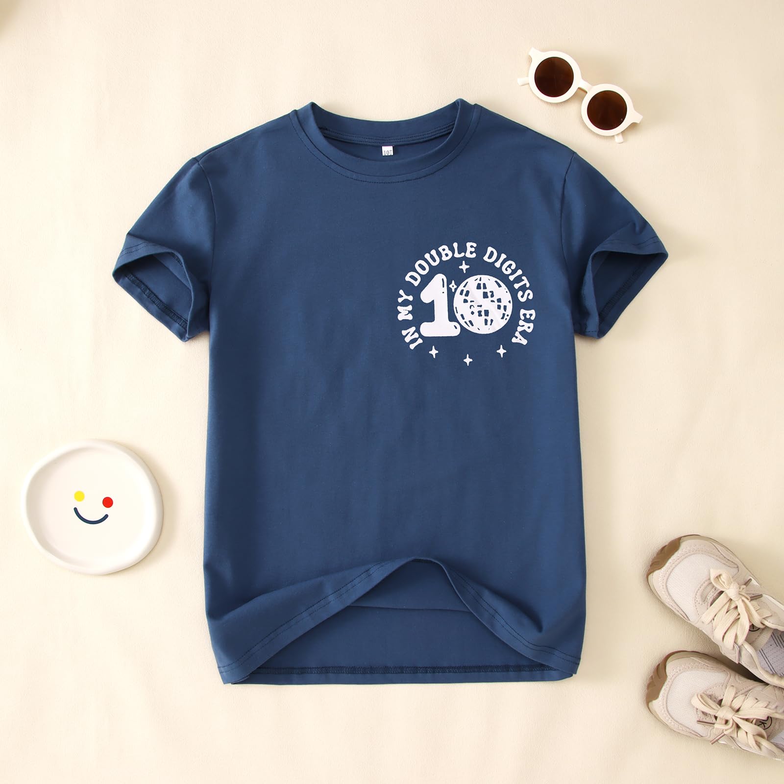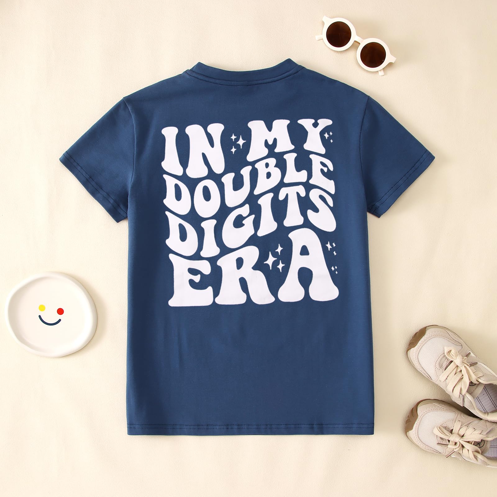 【Feature】In my double digits era t-shirts for boys. Short sleeve summer tees, classic round neck 10 years old boys shirts. 10th birthday boy t-shirt, groovy double-sided print design, in my double digits era letter print tops, star graphic, funny birthday gifts for 10 year old boys kids.
