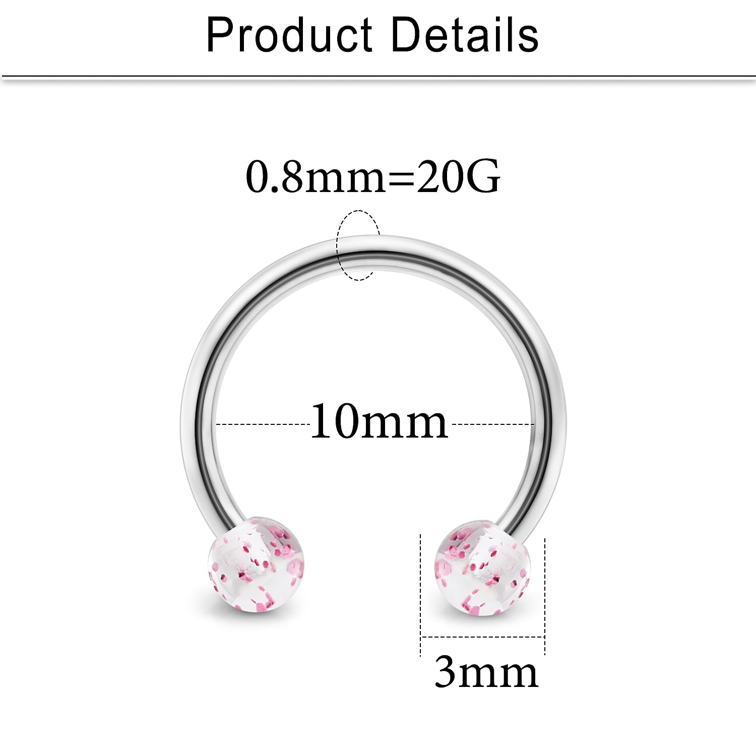 THICKNESS: Gauge Size: 20G (0.8mm); Inner Diameter of Horseshoe Barbell: 10mm (3/8");Balls Size:3mm. Color: Silver-tone, Black, Blue, Rose Gold, Rainbow, Gold-tone.