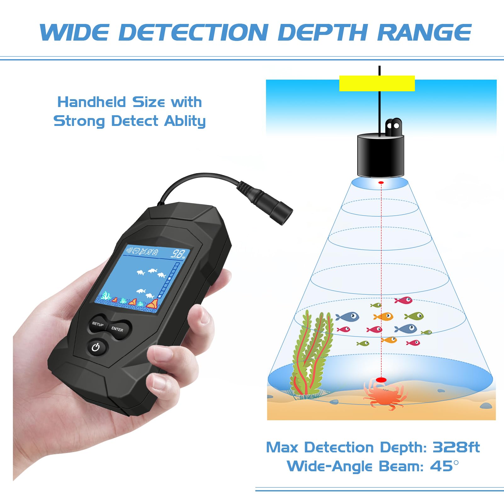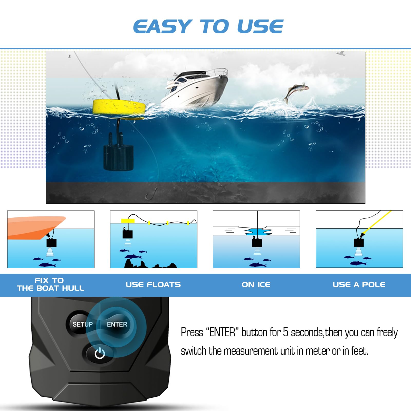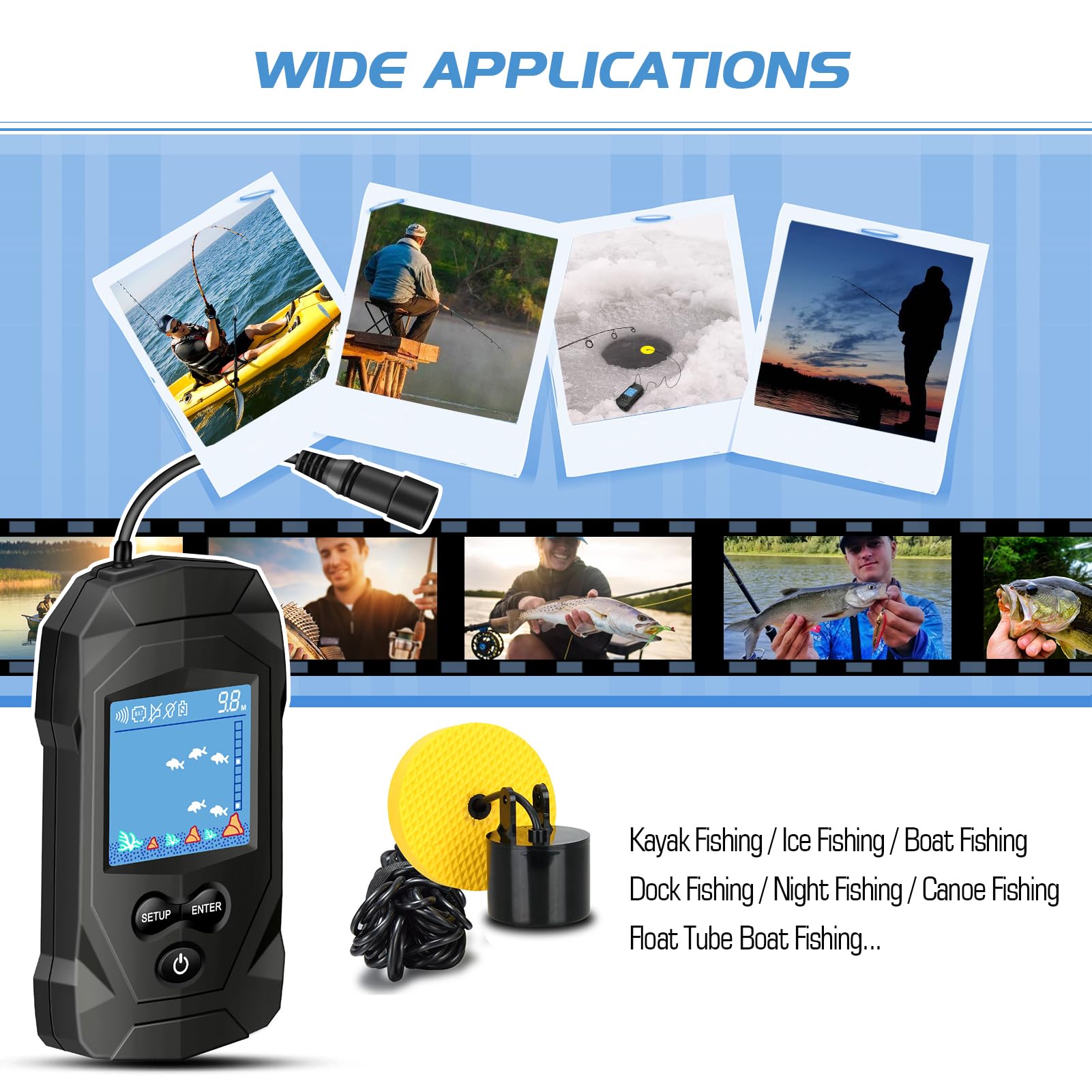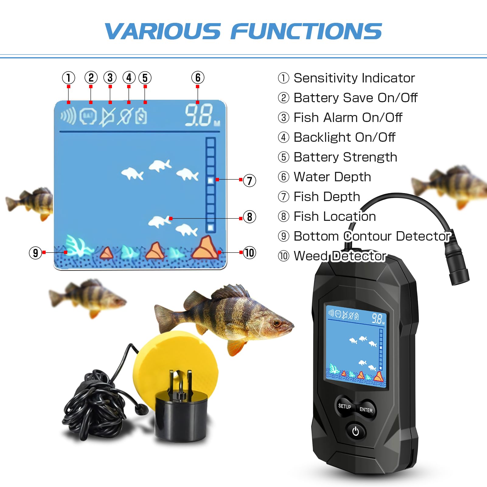 Water Depth Finder: The handheld fish finder has an fish and fish schools alarm function, when fish is detected, alarm will let you know at real-time. Depth Measurement Unit is selectable: FT/M. The portable fish finder powered by 4XAAA battery, and at power save mode, the water depth finder can work all day if you use new batteries.