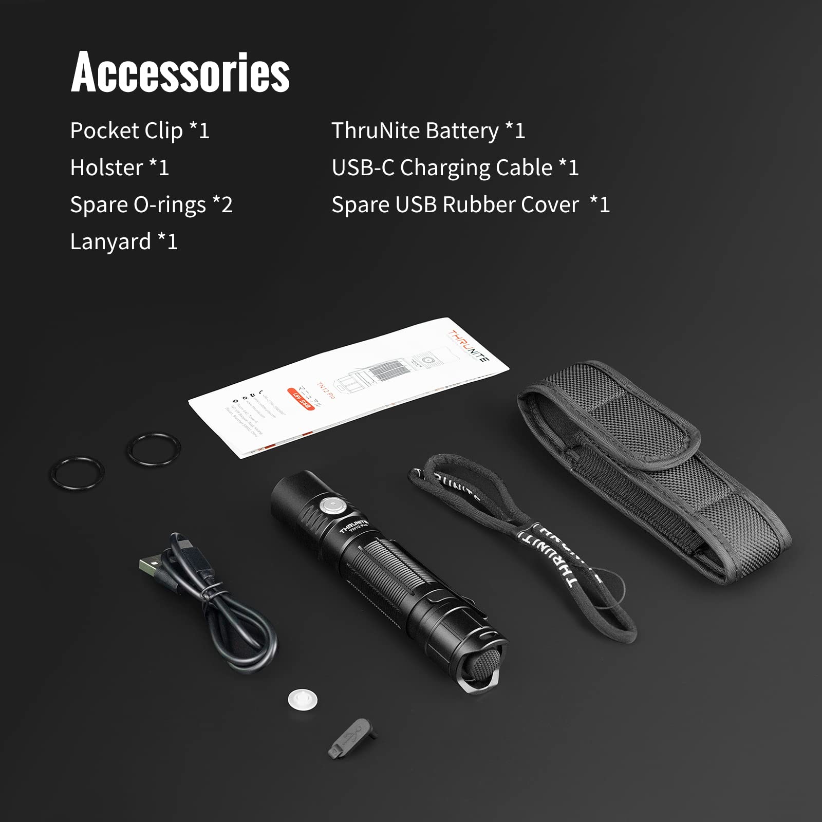 Specification: LED: SFT40 LED Runs on: ThruNite rechargeable battery. Working voltage: 2.75V-4.2V Output & Runtime (Tested with ThruNite battery) Turbo (1900 lumens down to 477 lumens / 7 mins+130 mins) Strobe (560 lumens / 4.5 hours) High (550 lumens / 2.5 hours) Medium (220 lumens / 9 hours) Low (50 lumens / 46 hrs) Firefly (0.5 lumens / 37 days) Max beam distance: 380 meters (max.) Waterproof to IPX-8 Standard (2 meters) Impact-resistant: 1.5 meters Dimensions: 131.5mm*27mm *25.5mm Weight: 85g (excluding battery). Accessories: Pocket Clip*1, Holster*1, Spare O-rings*2, Lanyard*1, ThruNite battery*1, USB-C Charging Cable*1, Spare USB Rubber Cover *1 Lock/Unlock When the flashlight is off, press and hold the side switch to enter the firefly mode. Under firefly mode, press and hold the side switch to access the lockout mode. Under the lockout mode, press and hold the side switch to unlock the flashlight. Turn-ON/OFF After the light is unlocked, press the side switch to turn the light ON/OFF. The light will turn on in the last mode used, except for firefly, turbo, and strobe. Change Modes Single-click the side switch to the last mode used, then press and hold the side switch to cycle through low, medium, and high. Shortcut to firefly: When the light is off, press and hold the side switch to get firefly mode. Double click quickly to turn to turbo from any mode. Triple-click quickly to get strobe. Direct Access to Turbo When the flashlight is unlocked, single-click the tail switch to access turbo mode directly. Rechargeable Function During charging, the indicator is RED. After being fully charged, the indicator will be BLUE. When the indicator flashes purple, it means abnormal charging. Please tighten the tail cap. Only firefly mode is available while charging.