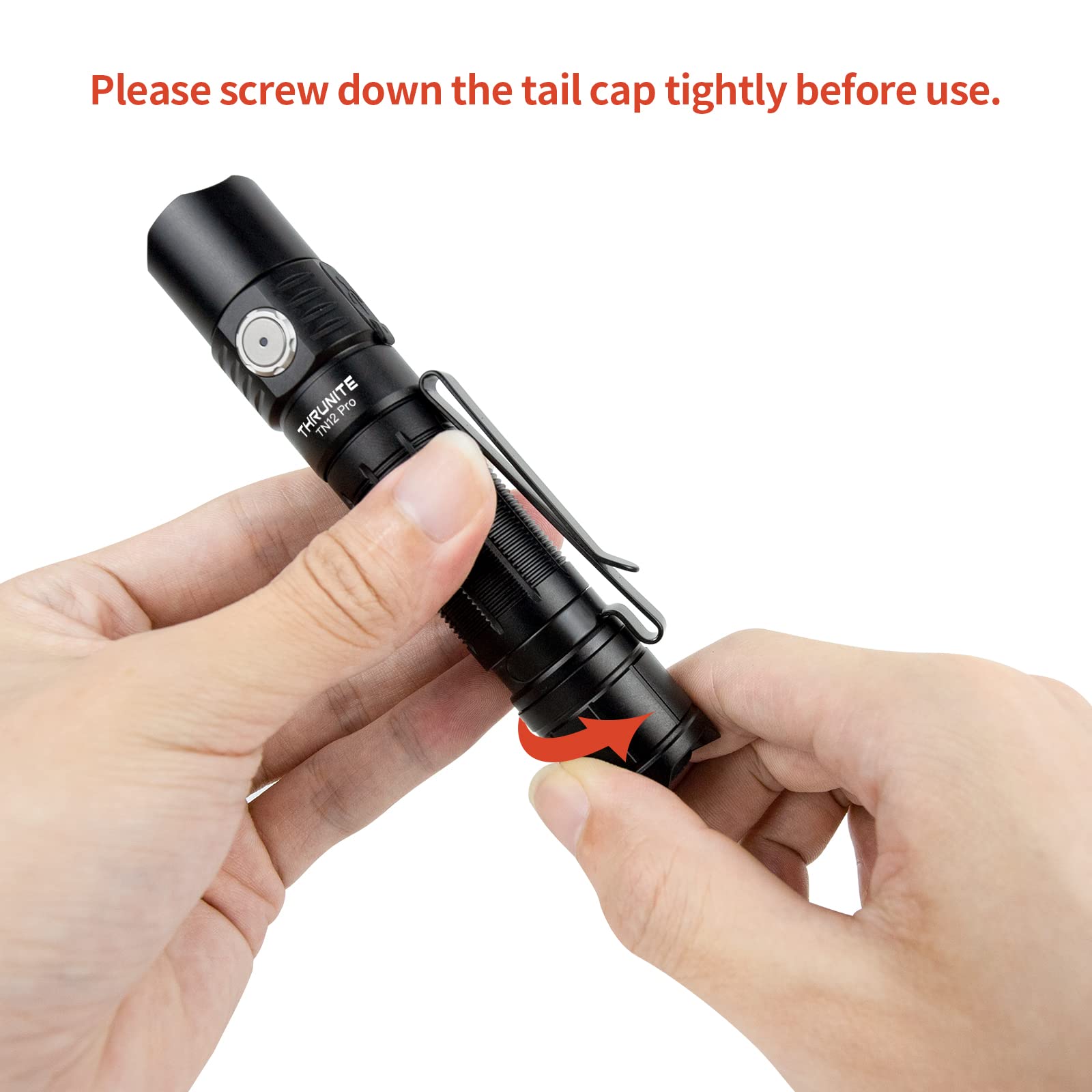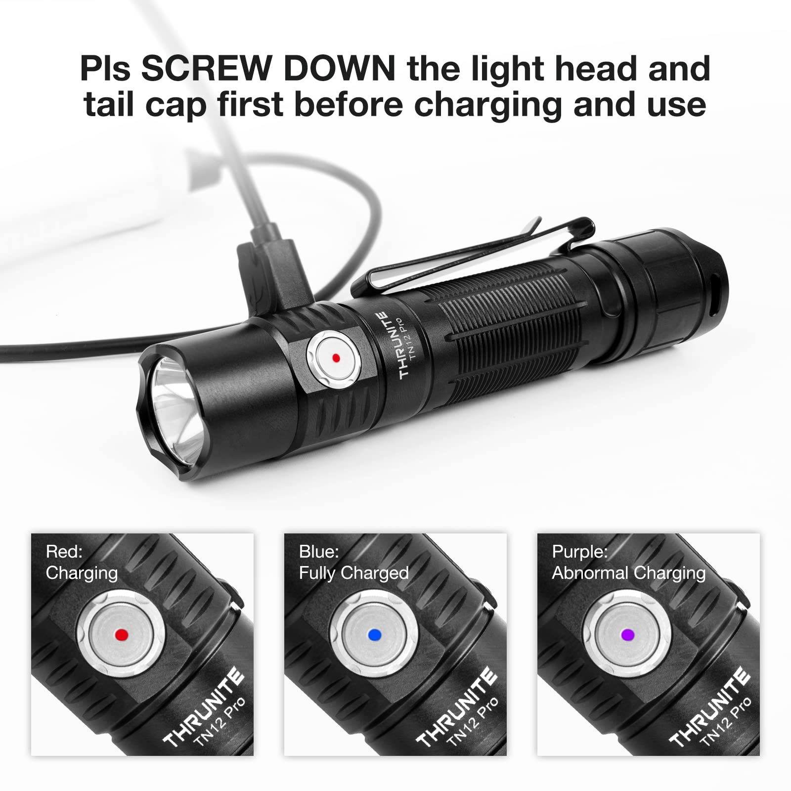 Please CHARGE the flashlight before use, and pls SCREW DOWN the light head and tail cap first before charging.