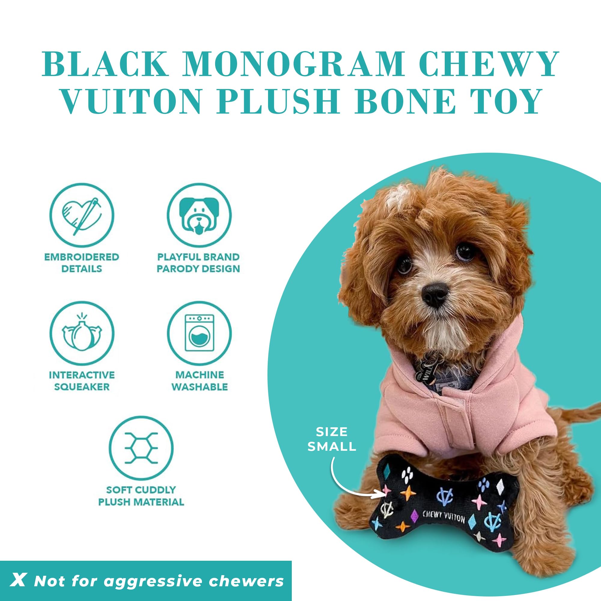 Funny Parody Plush Dog Toy: Let your furry fashionista fetch some fashion-forward fun with this Black Monogram Chewy Vuiton Bone in a stylish iconic black with a multi-color monogram pattern on the plush exterior with a built-in squeaker hidden inside. It’s a playful, cute interactive dog toy that combines style & fun. Size Large 6"x4"x1".