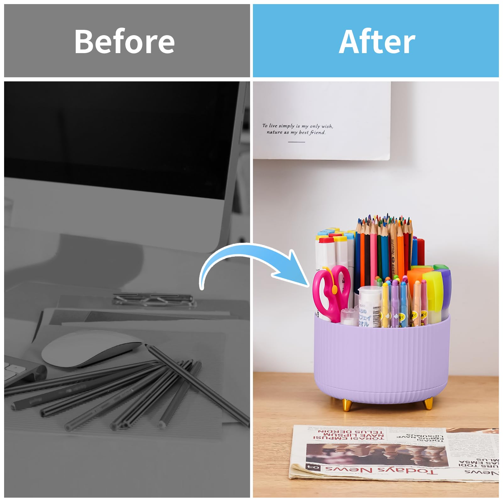 【Multipurpose Desktop Organizer】: This rotating storage organizer is perfect for pencils, cosmetics, bathroom necessities, toiletries, and even kitchen utensils. Try it in your craft room, playroom, laundry/utility room, and even inside bathroom cabinets or under the sink; Store extra office supplies like painting pens, correction tape, scissors, TV Remote, and more; Even headphones or a charger will no longer be lying around in the future! Maximize your vertical space and keep your desk clear