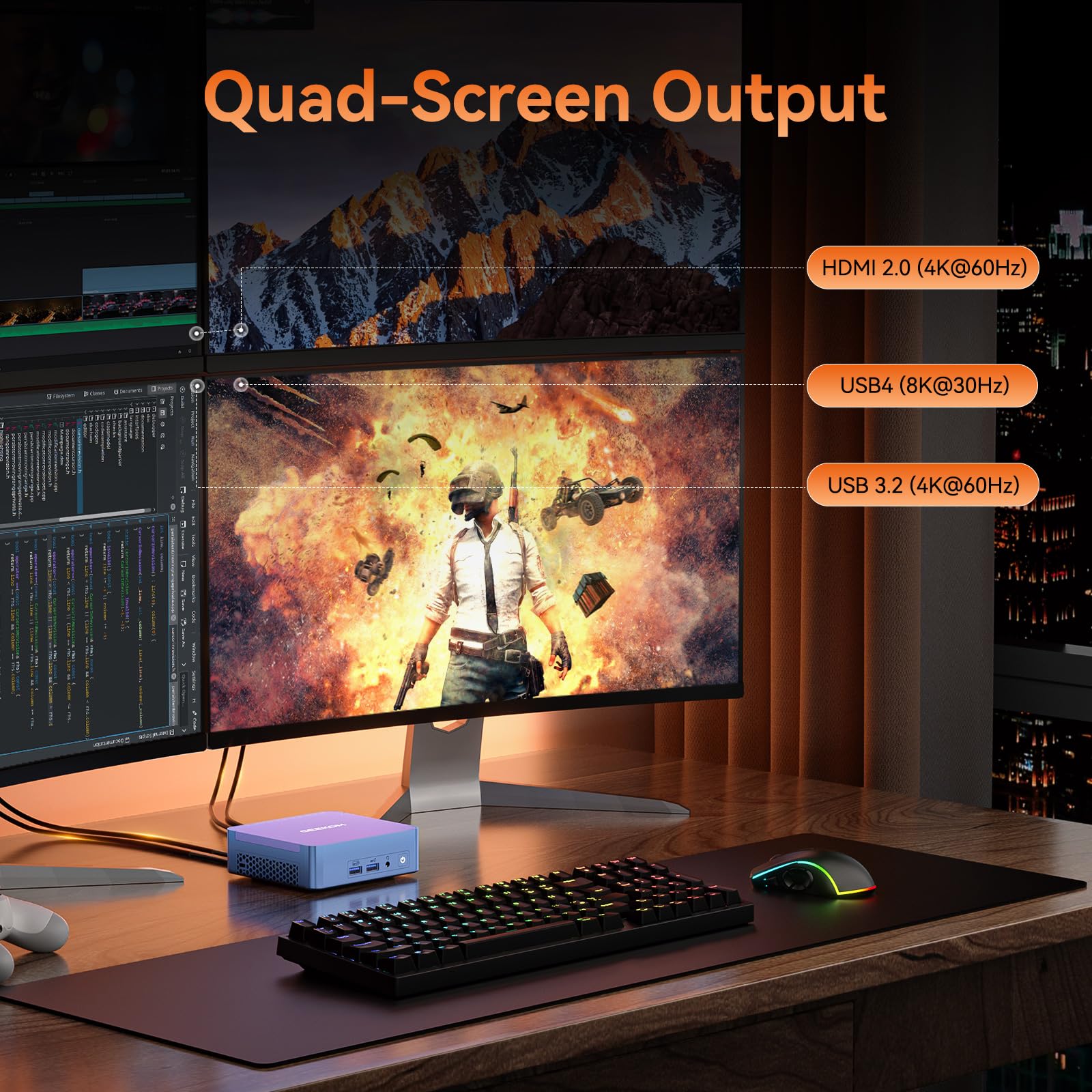 【Cooled by IceBlast & Efficient Multitasker】 GEEKOM AX8 Pro mini Computer comes with GEEKOM’s full proprietary IceBlast 1.5 active cooling system. With CPU fan and heat pipes placed strategically to quickly transfer heat away from key components, the mini PC will stay cool and stable when executing heavy workloads.With dual HDMI 2.0 and dual multi-function Type-C ports, the mini PC allows you to distribute computing tasks to up to four 4K monitors at the same time.