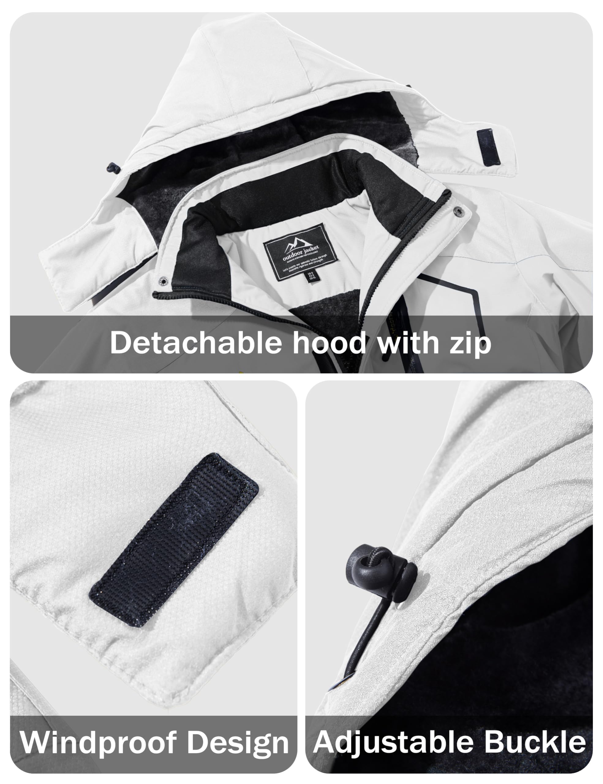 Windproof: Adjustable cuffs with hooks and loops; Internal drawcord hem, detachable and adjustable storm hood help to keep wind out