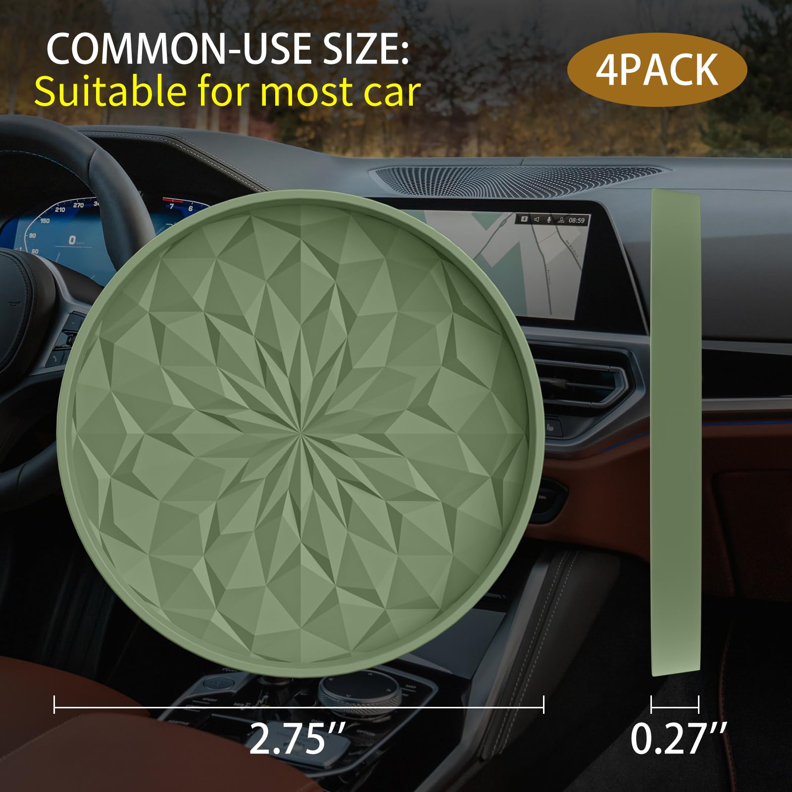 FIT MOST CAR CUP HOLDER SIZE: The thickening car cup coaster's thickness is 0.27'', the deep hem design can hold more overflow of water, juice and liquor from the cup. Diameter: 2.75'', which is suitable for most car cup holder applications. [ Please measure your car's cup slot size before purchasing, to avoid the size error to bring you trouble. ]