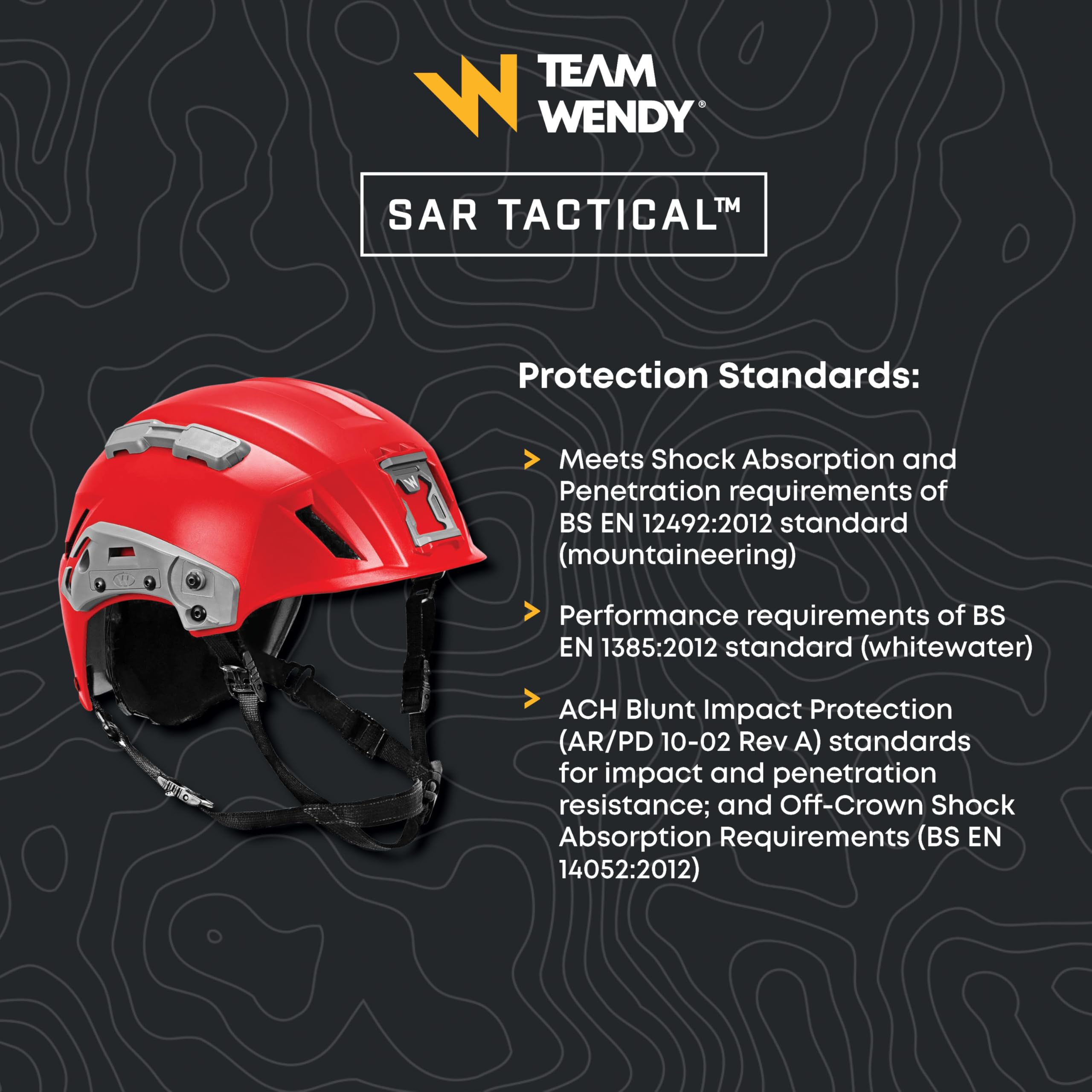 Protection Standards: Meets Shock Absorption and Penetration requirements of BS EN 12492:2012 standard (mountaineering); Performance requirements of BS EN 1385:2012 standard (whitewater); and ACH Blunt Impact Protection (AR/PD 10-02 Rev A) standards for impact and penetration resistance.