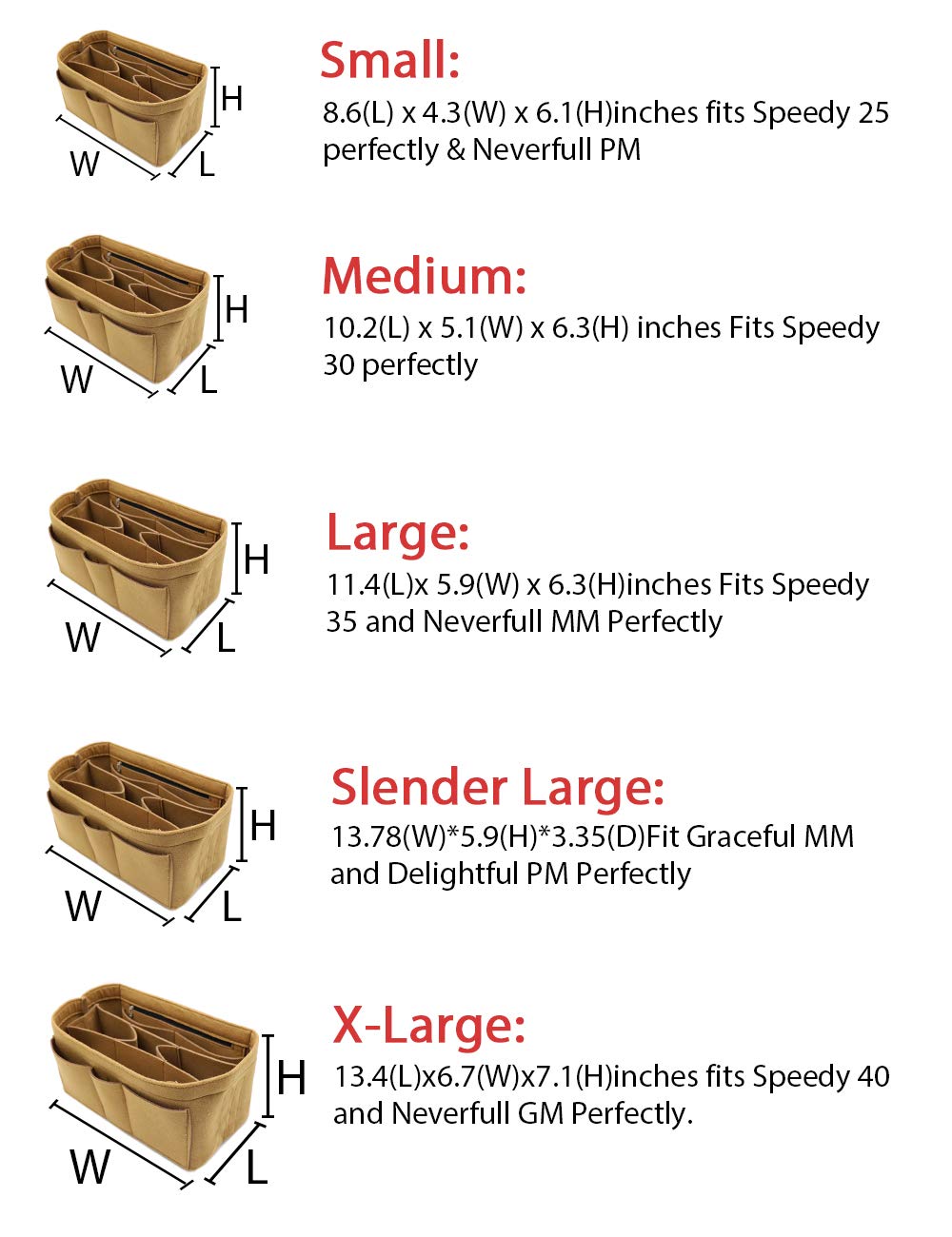 Small:8.6(L) x 4.3(W) x 6.1(H)inches fits LV Speedy 25 perfectly & LV Neverful PM ; Medium: 10.2(L) x 5.1(W) x 6.3(H) inches Fits Speedy 30 perfectly; Large: 11.4(L)x 5.9(W) x 6.3(H)inches Fits LV Speedy 35 and LV Neverful MM Perfectly.X-Large:13.4(L) x6.7(W)x7.1(H)inches fits LV Speedy 40 and LV Neverful GM Perfectly.Portable and Compact Purse Perfectly For any Brand, Such As LV, Longchamp Le Pliage Tote, MK, LV Petit Noe, Gucci, etc.