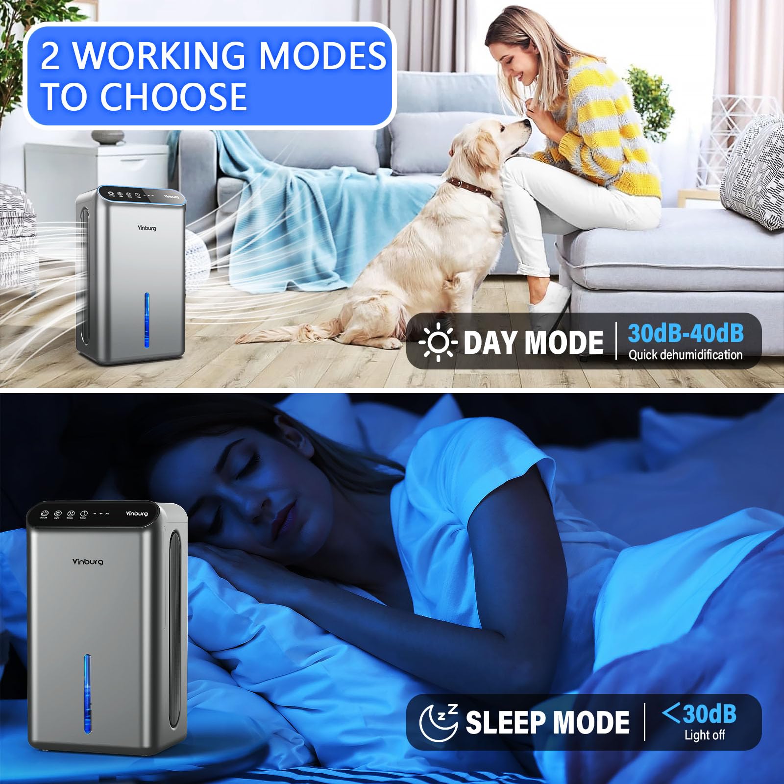 【Day & Sleep Mode with Whisper-Quiet Operation】This smart dehumidifier features two modes for all-day comfort. Day Mode delivers powerful moisture removal during active hours, while Sleep Mode lowers fan speed and noise to below 30 dB, turns off the lights, and creates a calm, undisturbed atmosphere—perfect for bedrooms, nurseries, and quiet workspaces.