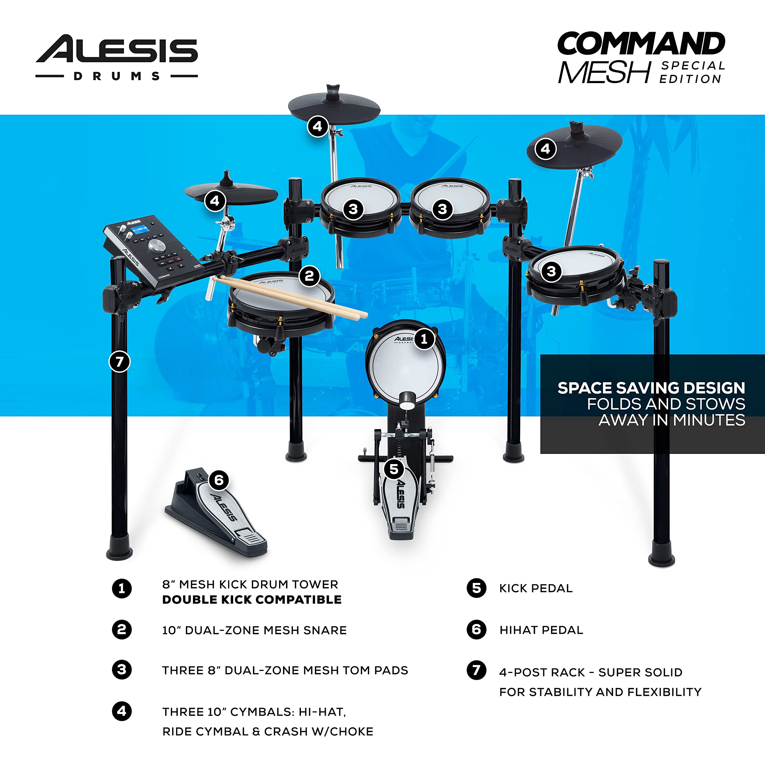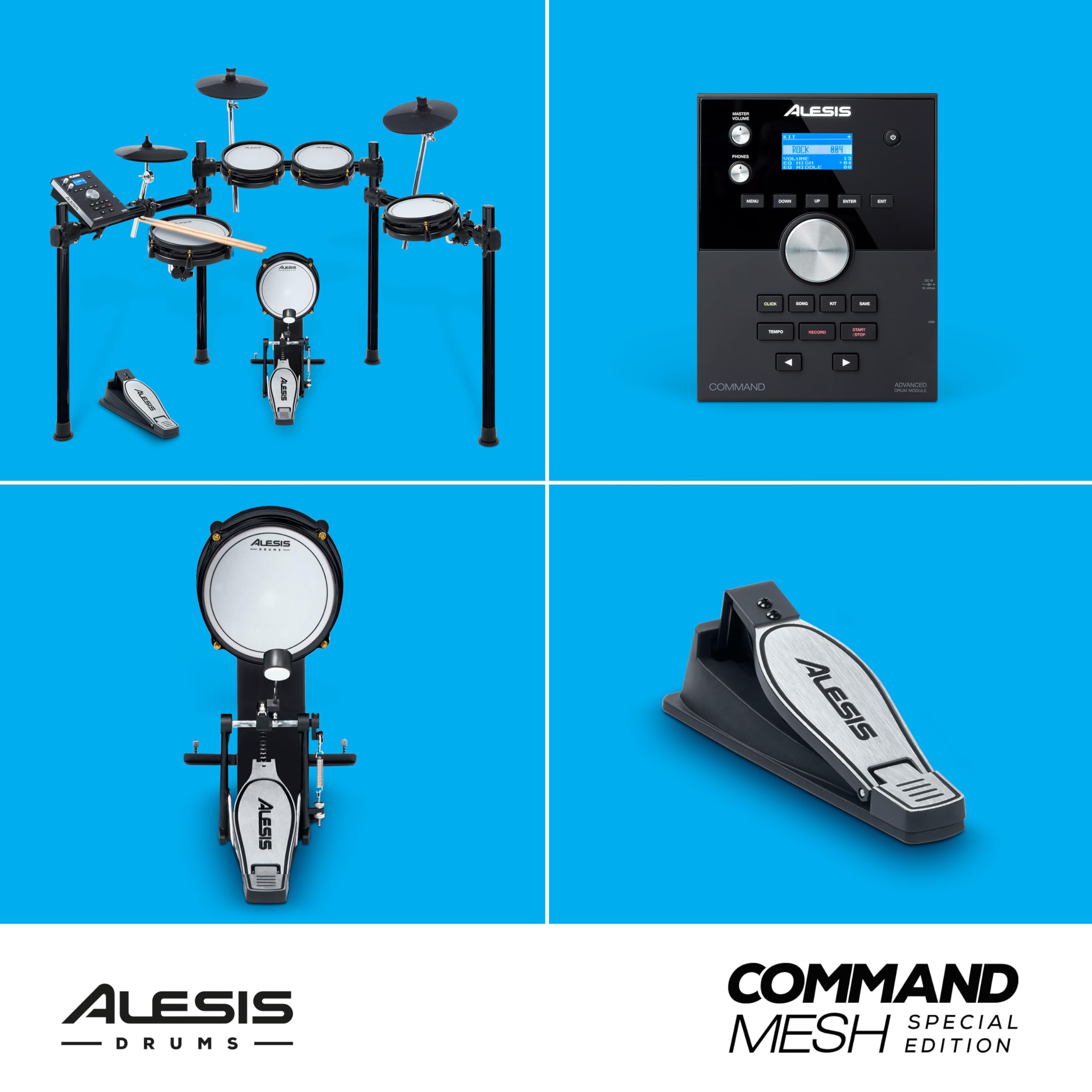 The Command Mesh Special Edition is an electronic drum kit that offers premium features and an unparalleled playing experience. It all starts with large mesh drum pads that feel natural and play just like acoustic drums. The cymbals are sturdy and responsive, with choke functionality on the crash and ride. At the heart of the experience is the Command Advanced Drum Module with hundreds of inspiring classic and modern sounds. For added customization, you can also load your own sounds via USB as well as record and save your performances directly to the module. All mounted to a premium four-post rack, the Command Mesh Special Edition delivers everything you need to start playing drums right away.