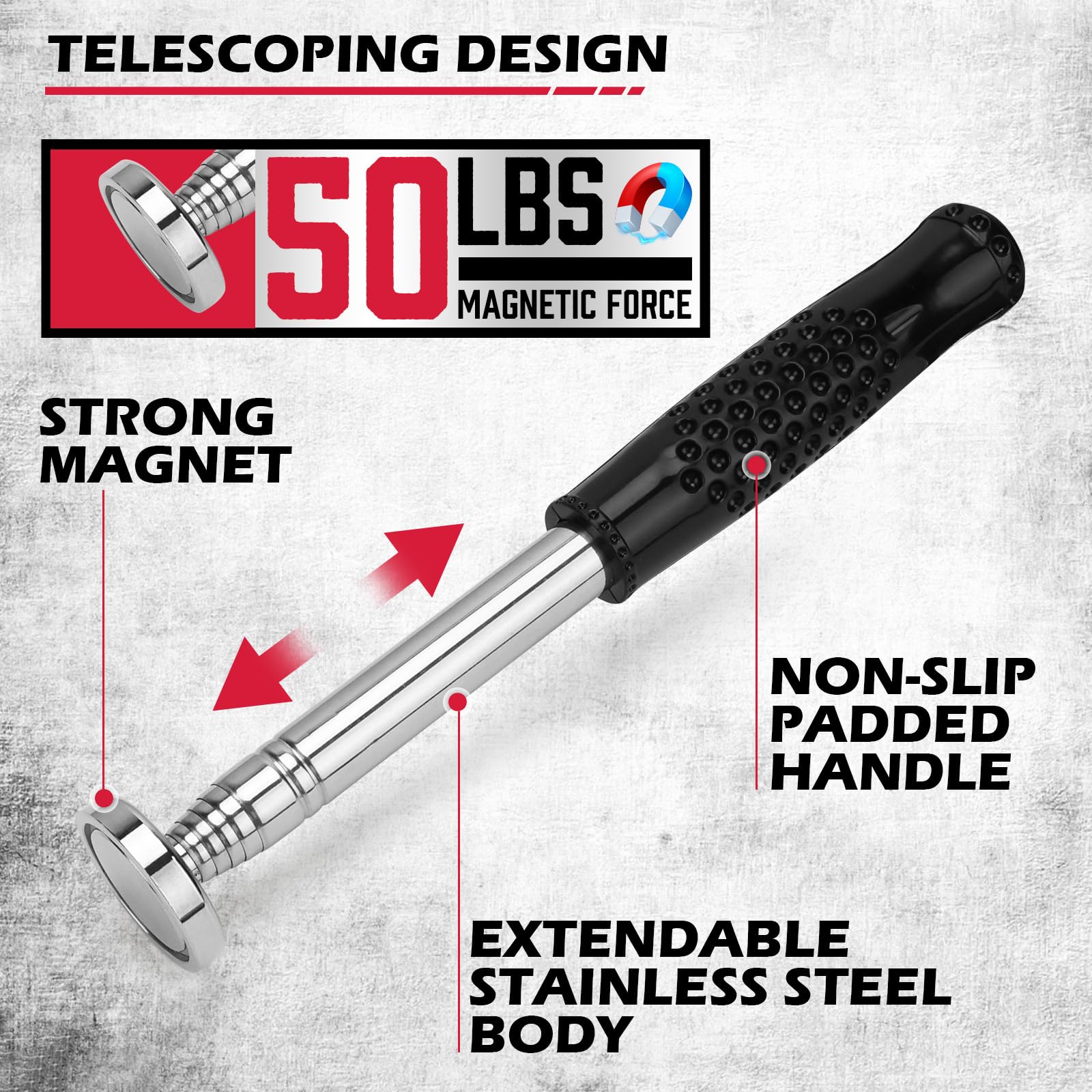 COMPACT AND PORTABLE - This lightweight telescoping magnetic pickup tool extends from 8.86″ to 40.9″, fitting into tight spaces under furniture or vehicles to pickup nails, screws, and metal debris—ideal for garages, workshops, and yards