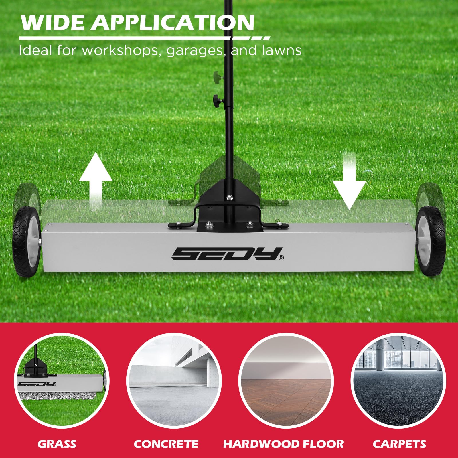 MAGNET DESIGN - The 36-inch rolling magnetic sweeper is designed to efficiently clear nails, screws, bolts, and metal debris with a high load capacity of up to 55 pounds, ensuring debris collection in workshops, garages, and construction sites