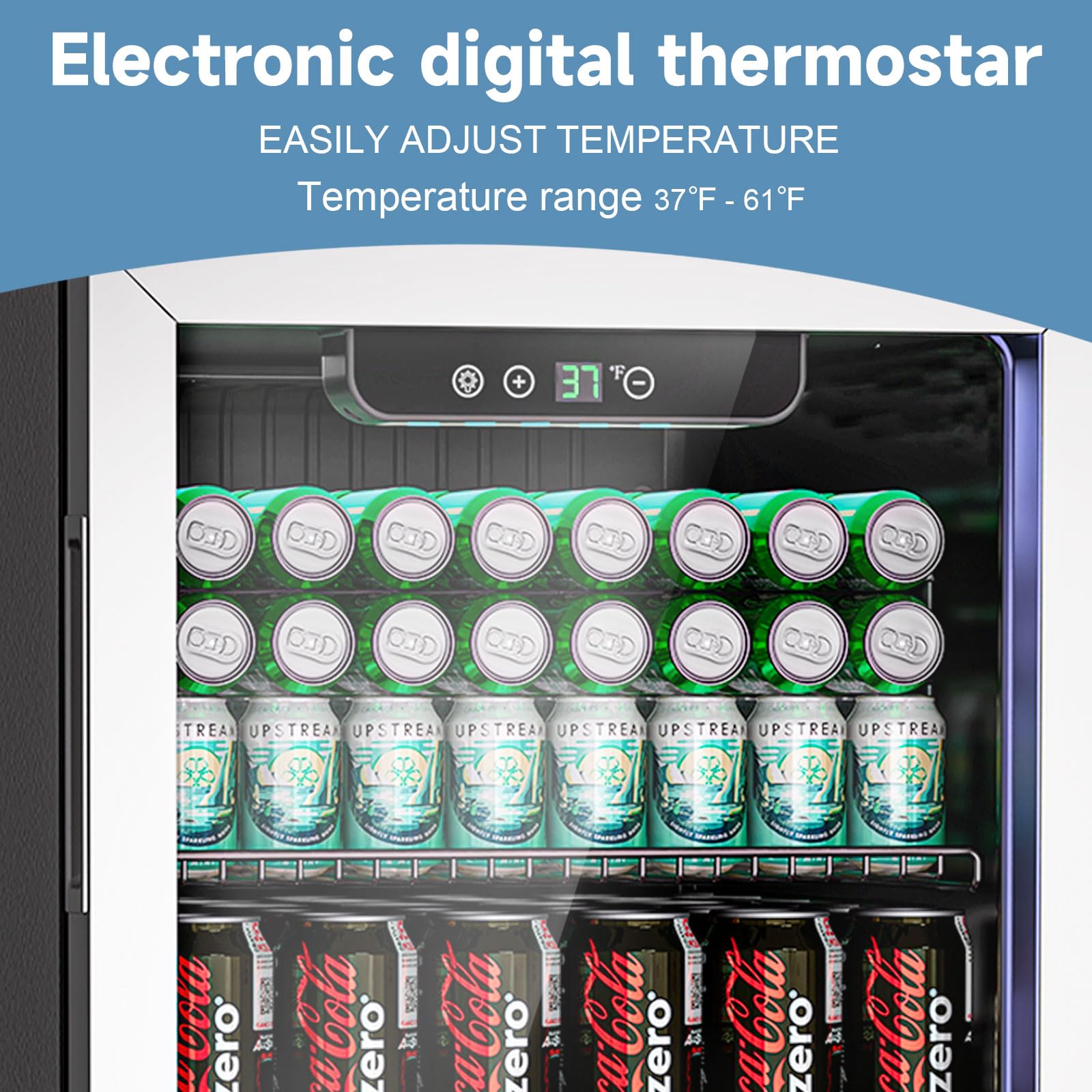 Our 24 inch beverage refrigerator (5.3 cubic feet, holds up to 166 cans) supports both built-in and freestanding installation, featuring precise digital temperature control (37°F - 61°F) to match the ideal chill for milk, cola, champagne, and red wine, plus user-friendly designs like removable shelves, a touch screen panel, soft LED lighting, and a super-sealed glass door with a lock; it operates quietly (under 40dB), has a sleek stainless steel and glass appearance, suits scenarios such as home bars, kitchens, offices, and parties, and comes with a 1-year warranty, solving the hassle of cluttered regular fridges and inconsistent drink temperatures for drink lovers, families, and party hosts.