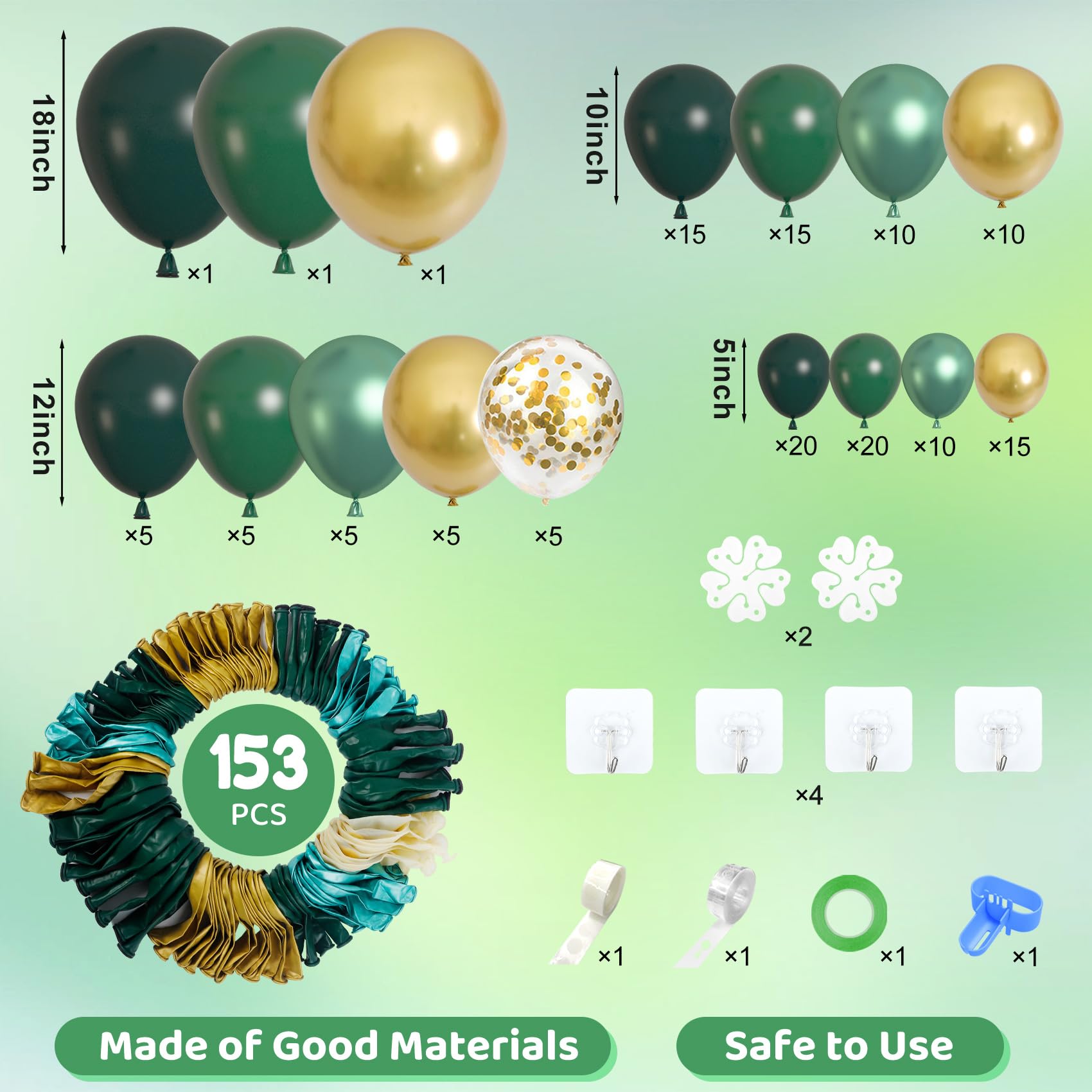 Sufficient Quantity of Green and Gold Balloons: Green balloon garland includes 18 in dark green/retro dark green/metallic gold balloons(3 pcs),12 in confetti/dark green/retro dark green/metallic green/metallic gold balloons(25 pcs), 10 in dark green/retro dark green/metallic green/metallic gold balloons(50 pcs), 5 in dark green/ retro dark green/metallic green/metallic gold balloons(65 pcs) and 10 pcs balloon tools(balloon arch strip, tying tool, glue points, ribbon, flower balloon clip, hooks)
