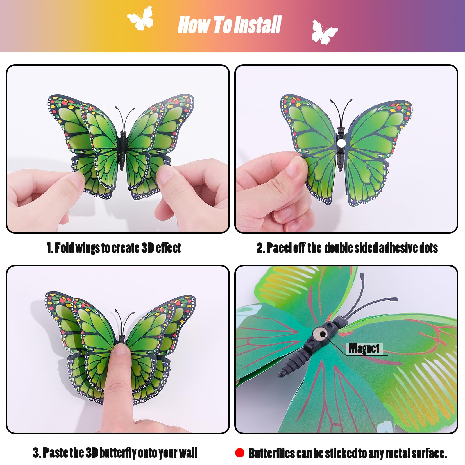 【Package Included】A set of 24 Pcs butterfly of 12 styles. 4 Pcs-4.7 inches, 4 Pcs-3.9 inches, 8 Pcs-3.1 inches , 8 Pcs-2.3 inches. Coming with 30 Pcs adhesive dots, extra glue points for replace.