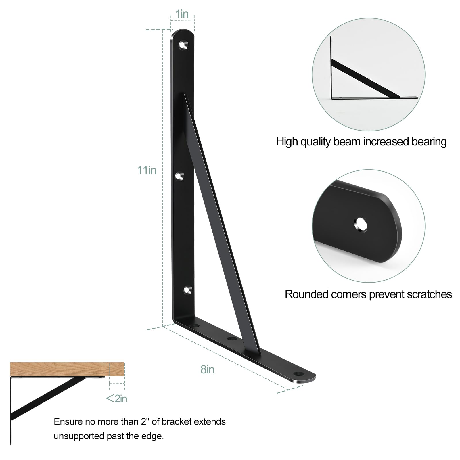 Heavy Duty design, maxium support weight of 240lb for a pair of this shelf bracket. Designed to support 11 inches to 15 inches deep shelf. Matte black powder coat finish. resistant to corrosion and rust, durable. Creating a rustic, reclaimed, salvaged look,perfect for your home, office, garage, work space or anywhere else.