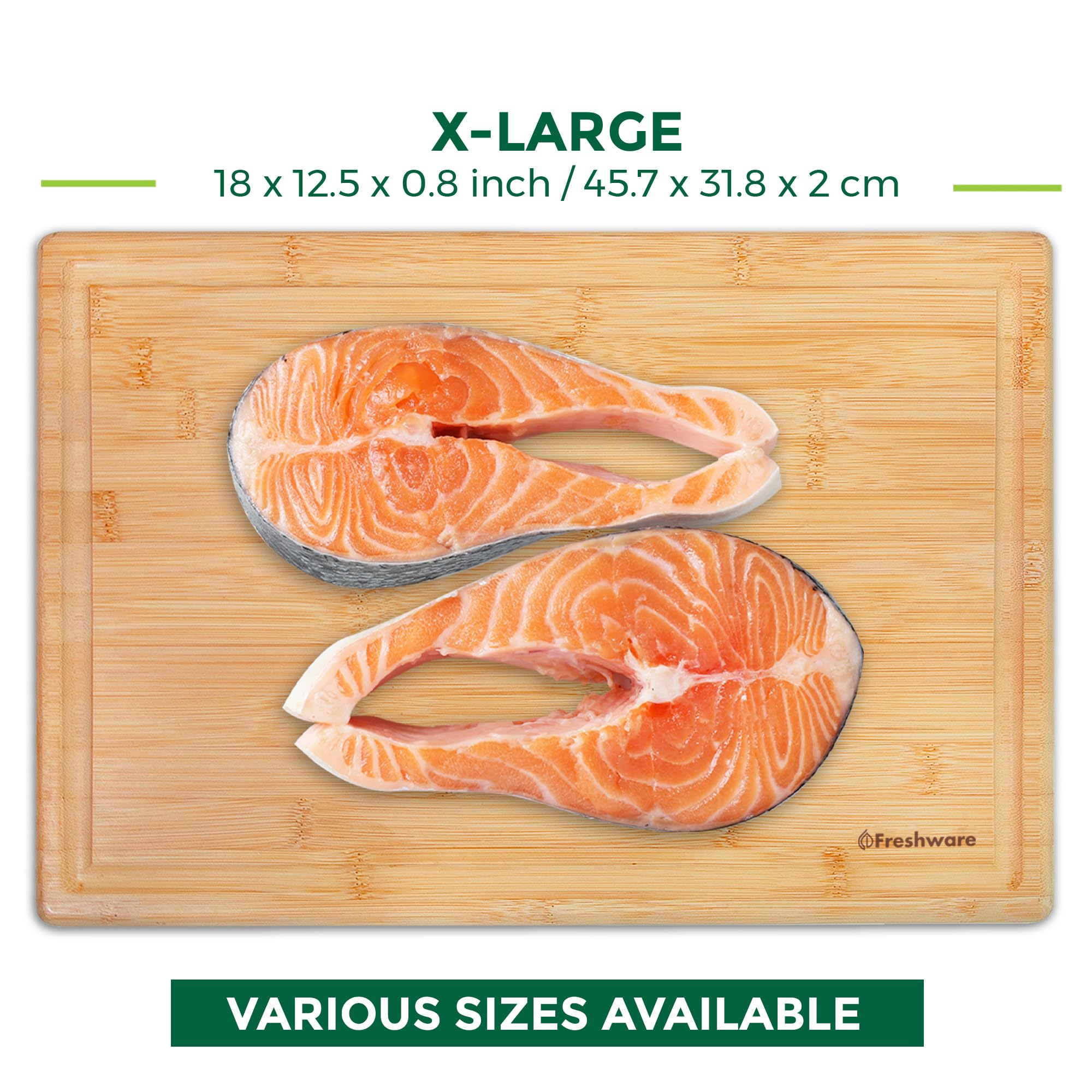 Stay Fit and Healthy - Chop, Slice or Dice your Delicious Homemade Food With The #1 Bamboo Cutting Board By Freshware! Enjoy Freshware professional quality cutting board. Ideal to meet all your meal prep needs for cutting fruits, vegetables, meat and bread. Plus, they won’t dull your favorite kitchen knives. Made from 100% moso bamboo, this cutting board will be your best buddy in kitchen. Our elegant 2-in-1 reversible design with smooth, rounded edges, juice grooves and handles can be used as a serving tray or trivet mat for hot dishes. This cutting board set is a perfect gift to friends or families for birthday party, housewarming event, wedding ceremony or holiday seasons. Sturdy and Lightweight. Our chopping board is extremely sturdy yet lightweight and can be carried everywhere you go. At a picnic in the woods, a beach excursion or lake camping! Easy to Clean. Use hot water and soap to wash, then let the cutting board air dry. Occasionally use mineral oil to extend the life of the cutting boards. Bamboo is easier to wash than a wood cutting board and safer than plastic. Hand wash only. Do not use in dishwasher. Packages Includes: ✅ 1 x Extra Large Cutting Board: 18 x 12.5 x 0.8 inch or 45.7 x 31.8 x 2 cm. ✅ Material: 100% Moso Bamboo. Freshware is full of passion and craftsmanship that we have devoted ourselves to bringing you the finest cutting board to meet all your chopping needs at a value without compromising quality.