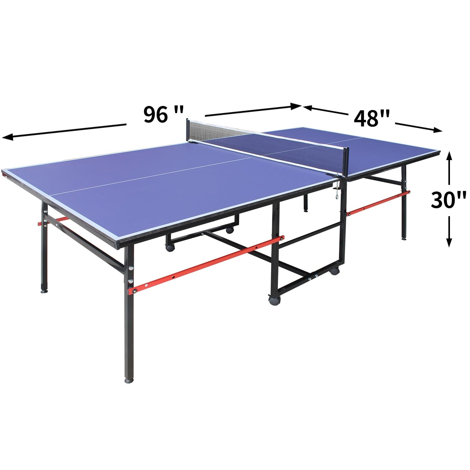 Bring families together for an exciting table tennis game! Ping pong is a game with low demanding that fits for all ages and abilities. Perfect for taking a break of work with colleague or play with kids on weekends, it can bring families together. Features: ➤ Lockable wheels for portability. ➤ 8'x 4' space-saving table tennis table. ➤ 1/2” MDF tabletop with silkscreen striping. ➤ Turn into single playback mode to practice yourself. Specifications: ➤ Dimension: 96”(L) x 48”(W) x 30”(H) ➤ Package Includes: 1 x Table Tennis Table, 1 x Net and Post Set, 2 x Table Tennis Rackets, 3 x Balls This 8'x 4' space-saving table tennis table is a perfect gift for your kids to have fun.