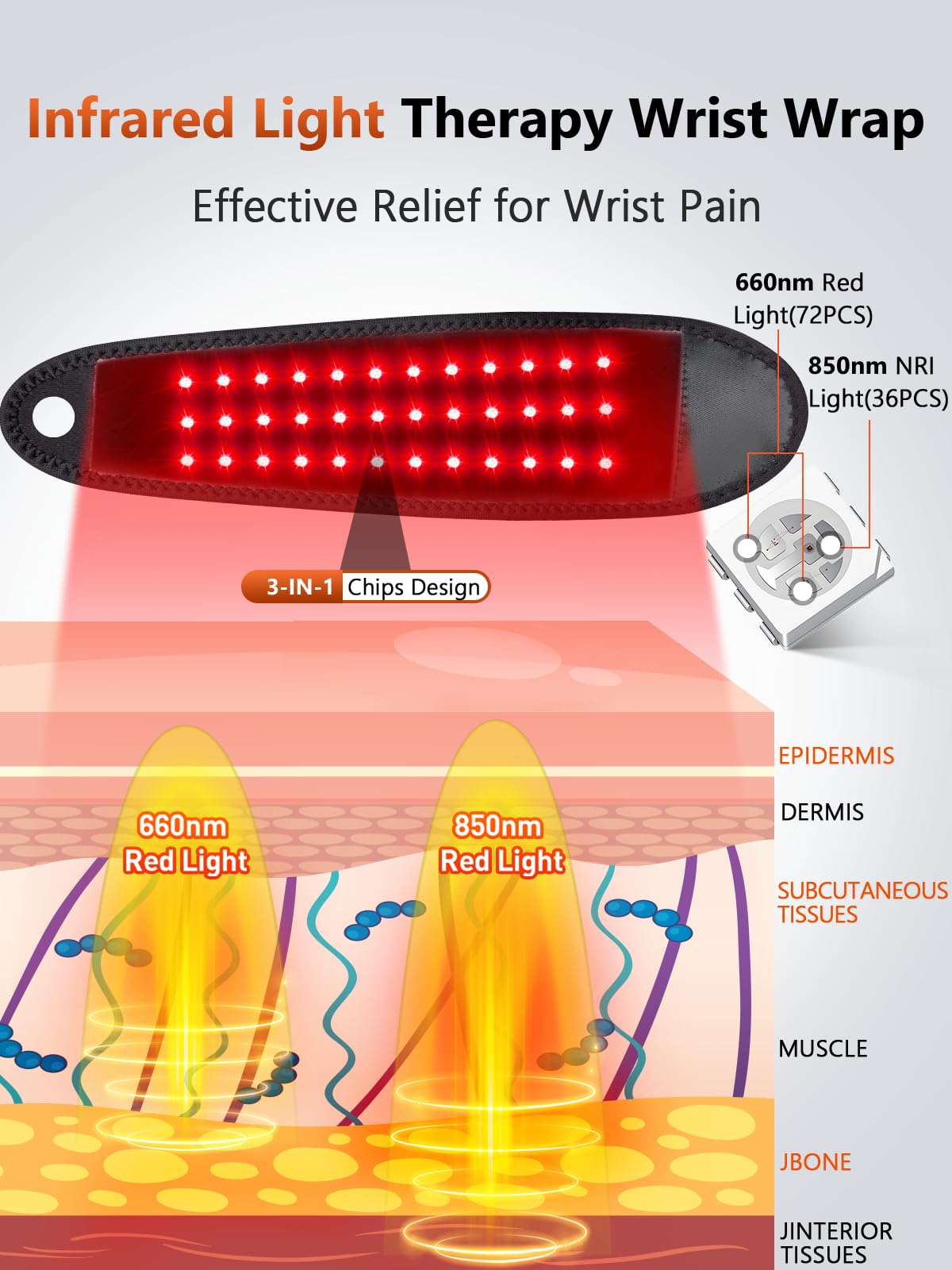 【Red & Near-Infrared Wrist Wrap】Featuring 72pcs of 660nm red lights and 36pcs of 850nm near-infrared lights relieves hand wrist fatigue and pain, improves circulation, relax muscle. Near-infrared lights with the strong ability to penetrate deep into tissues, ideal for wrist muscle and bone spurs recovery, reducing wrist joint inflammation and associated wrist pain.